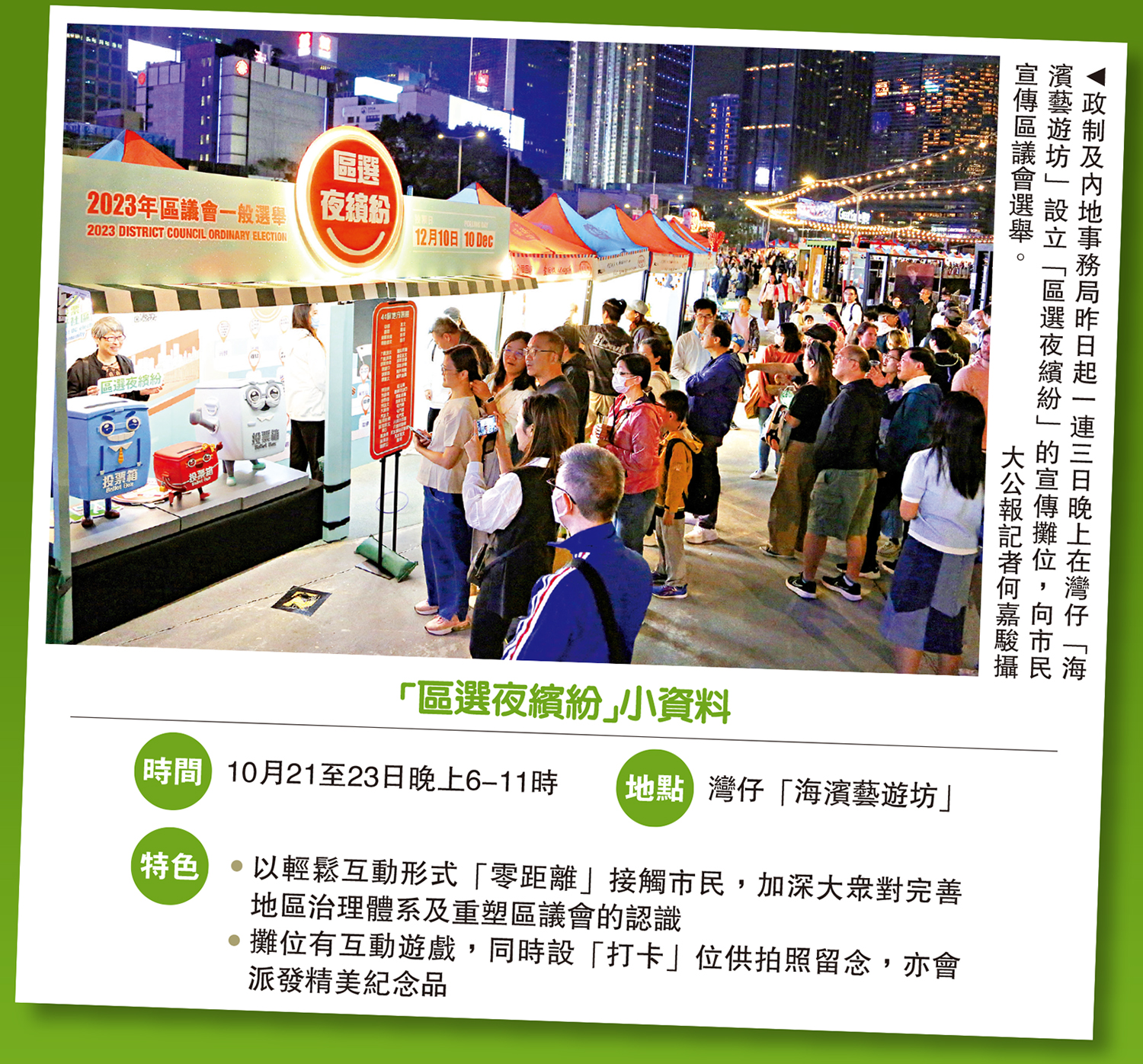 「1210區選齊投票,共建美好社區。」2023年區議會一般選舉將於12月10日舉行。為了讓市民明白到完善地區治理體系及重塑區議會對特區良政善治、社區美好生活,以及市民安居樂業的重要性,政制及內地事務局昨日起一連三日晚上在灣仔「海濱藝遊坊」設立「區選夜繽紛」宣傳攤位。