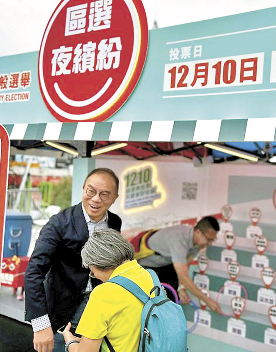 政制及內地事務局局長曾國衞昨日下午到場為布置攤位的工作人員打氣。不少市民見到曾國衞即到攤位前和他「打卡」合照,還一起試玩了遊戲,以認識選區劃分,了解區議會選舉及其他完善地區治理體系的情況。