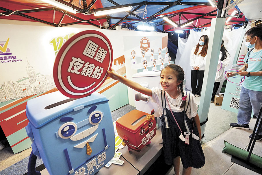 政制及內地事務局昨日起一連三晚在灣仔海濱藝遊坊設立「區選夜繽紛」宣傳攤位,現場有擲圈遊戲及打卡位,市民可以手持「1210」「區選齊投票 共建美好社區」的字牌在攤位前影相,完成遊戲還可贏取紀念品。有到場的新來港人士坦言,由於居港未滿七年,今次還不能投票,但希望藉此了解香港的選舉制度。有市民強調,投票是作為市民應盡的責任,支持特區政府多做選舉宣傳。