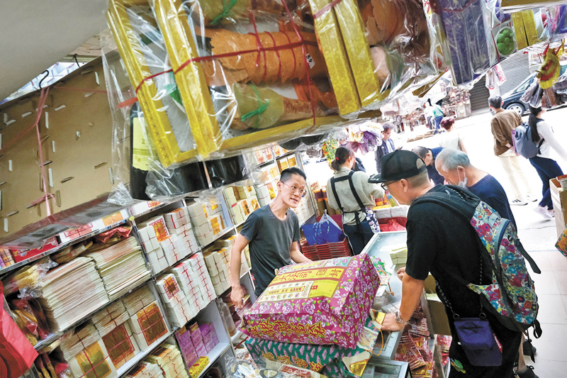 香港文匯報記者昨日到皇后大道西「雀仔橋」附近幾間紙紮舖巡察重陽節紙紮品等祭品銷情。記者現場所見,不少市民正在店舖內仔細選購各類香燭、紙紮品,有市民拿起貨品向職員查詢,不時有市民購買了一大袋滿足離場。