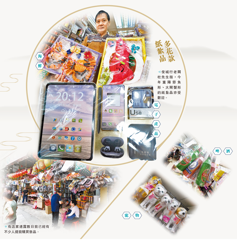 臨近重陽節,有不少孝子賢孫已提前購買所需的紙紮祭品,有過往因疫情而未有在重陽拜祭的市民,今次購買了400多元的祭品。有市民表示,即使在疫情期間有「限聚令」,仍堅持與家人每年春秋二祭前往拜祭先人:「身為中國人要慎終追遠。」