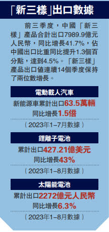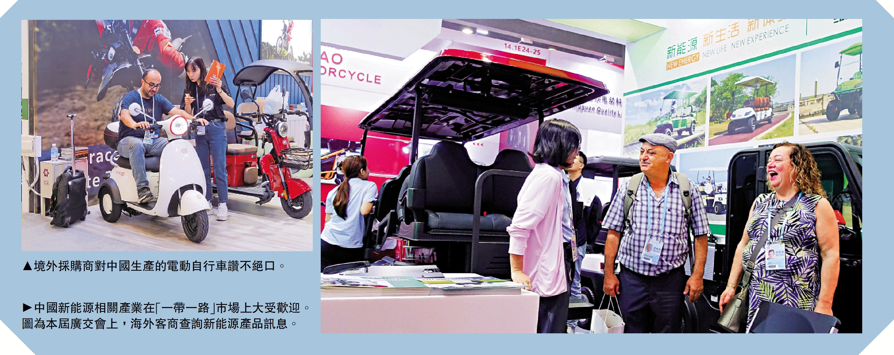(大公報 記者 盧靜怡)第134屆廣交會第一期近日落下帷幕,迎來了「丁財兩旺」的開門紅。在第二期開幕前的間隙,不少外貿企業已經邀約在廣交會結識的採購商到廠房看樣板,掀起一波「探廠潮」。官方數據顯示,截至19日,本屆廣交會一期境外採購商線下到會超10萬人,來自共建「一帶一路」國家採購商近7萬人,比上屆同期增長65.2%。當中人氣最足的要數「新三樣」出口產品。本屆廣交會上,鋰電池、太陽能電池、電動車「新三樣」企業展位火爆,將中國綠色環保產品技術銷往「一帶一路」沿線國家和地區。