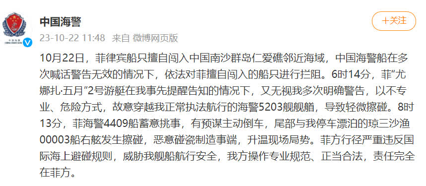 據中國海警官方微博消息,10月22日,菲律賓船隻擅自闖入中國南沙群島仁愛礁鄰近海域,中國海警船在多次喊話警告無效的情況下,依法對菲擅自闖入的船隻進行攔阻。