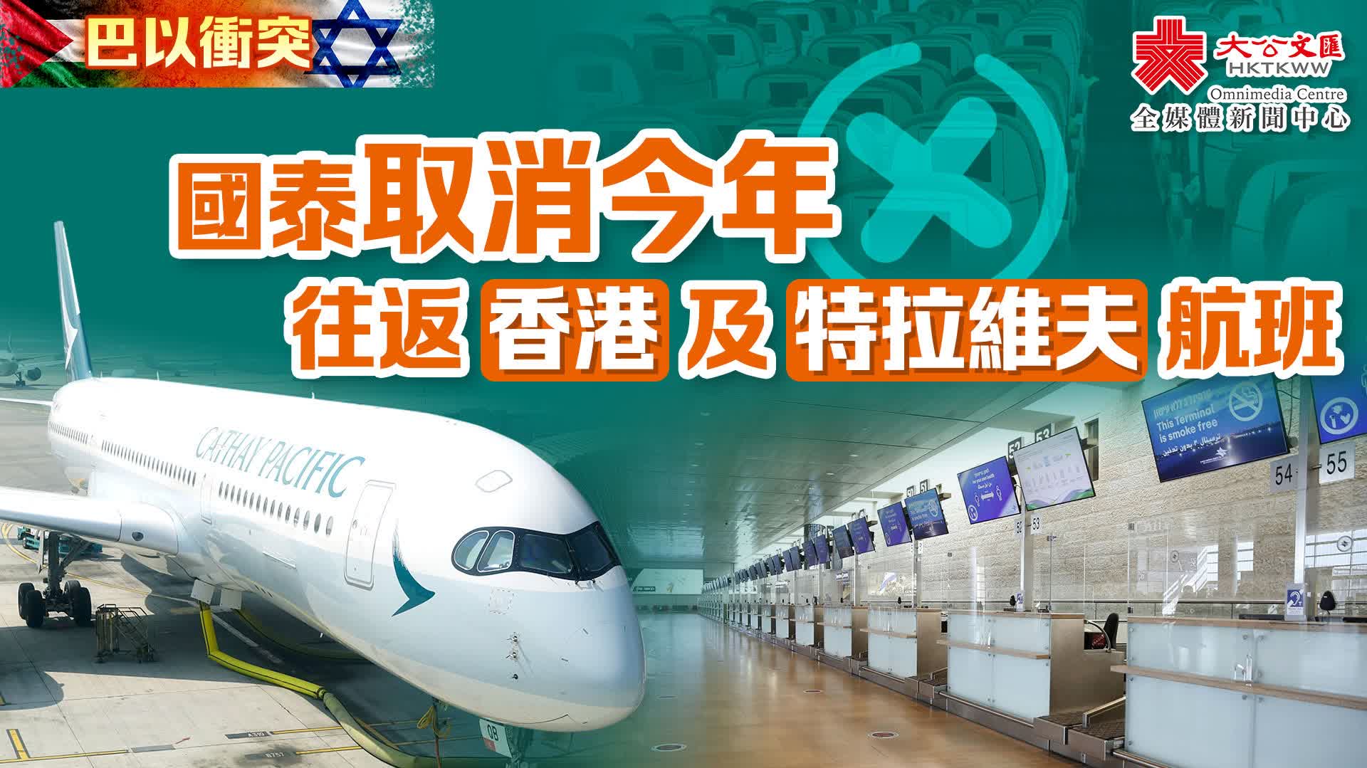 大公文匯全媒體報道,因應以色列的局勢持續發展,國泰航空今日(22日)宣布,將取消由即日至2023年12月31日(包括當日)往返香港及特拉維夫的所有航班。