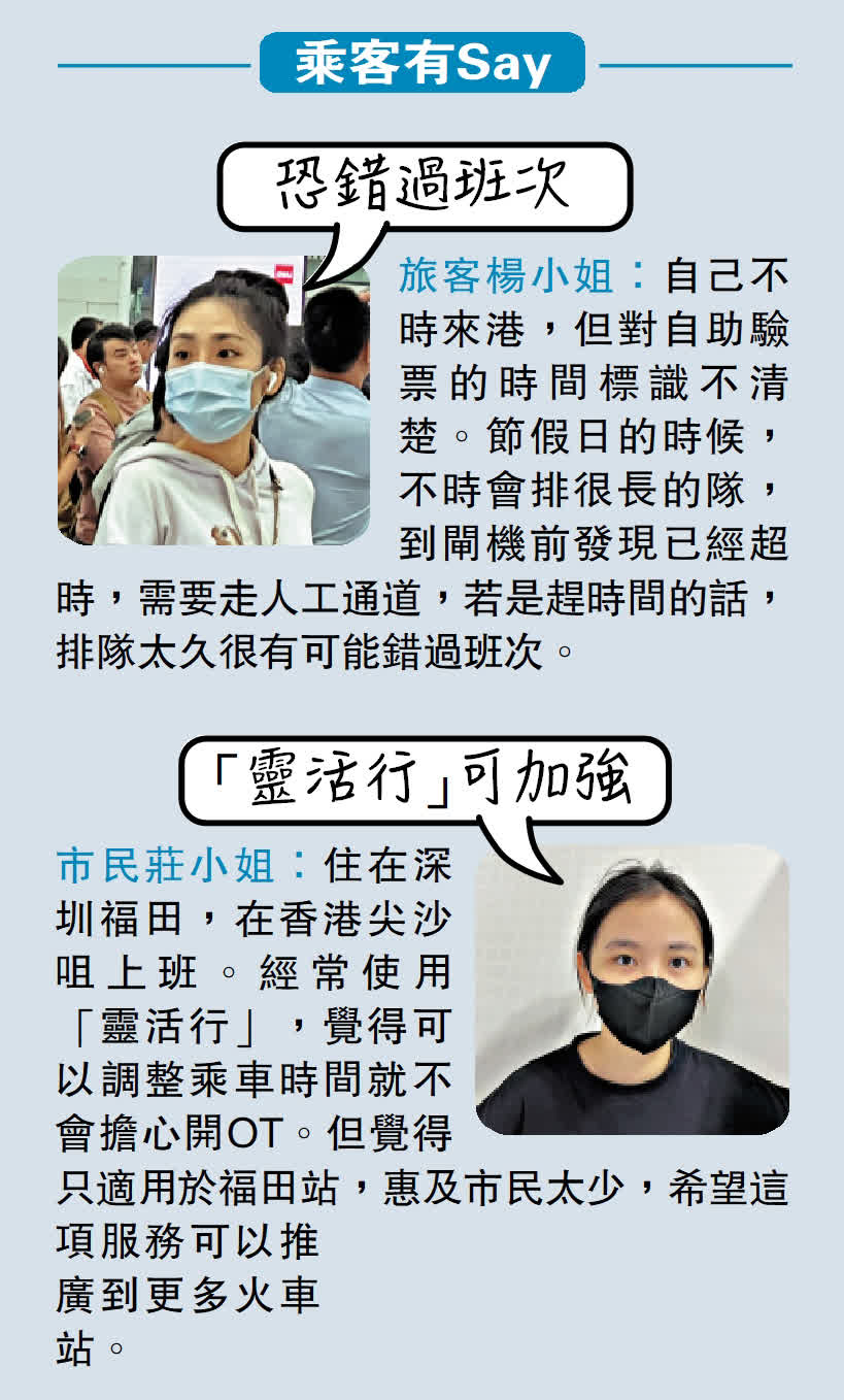 乘客蔡先生和太太及五個月大的兒子來自潮汕,指昨日從西九龍站坐高鐵返鄉下過關時很繁複,花了個多小時才能完成。亦有不少乘客反映過關時遇到問題,包括車站部分指示不清,例如在自助檢票的可用時間上沒有明顯標識,導致在排完自助檢票的隊列後才知道自己需要到人工檢票通道入站;重重的行李檢查亦令旅客感到不便,掃碼的位置又時常出現排隊堵塞。