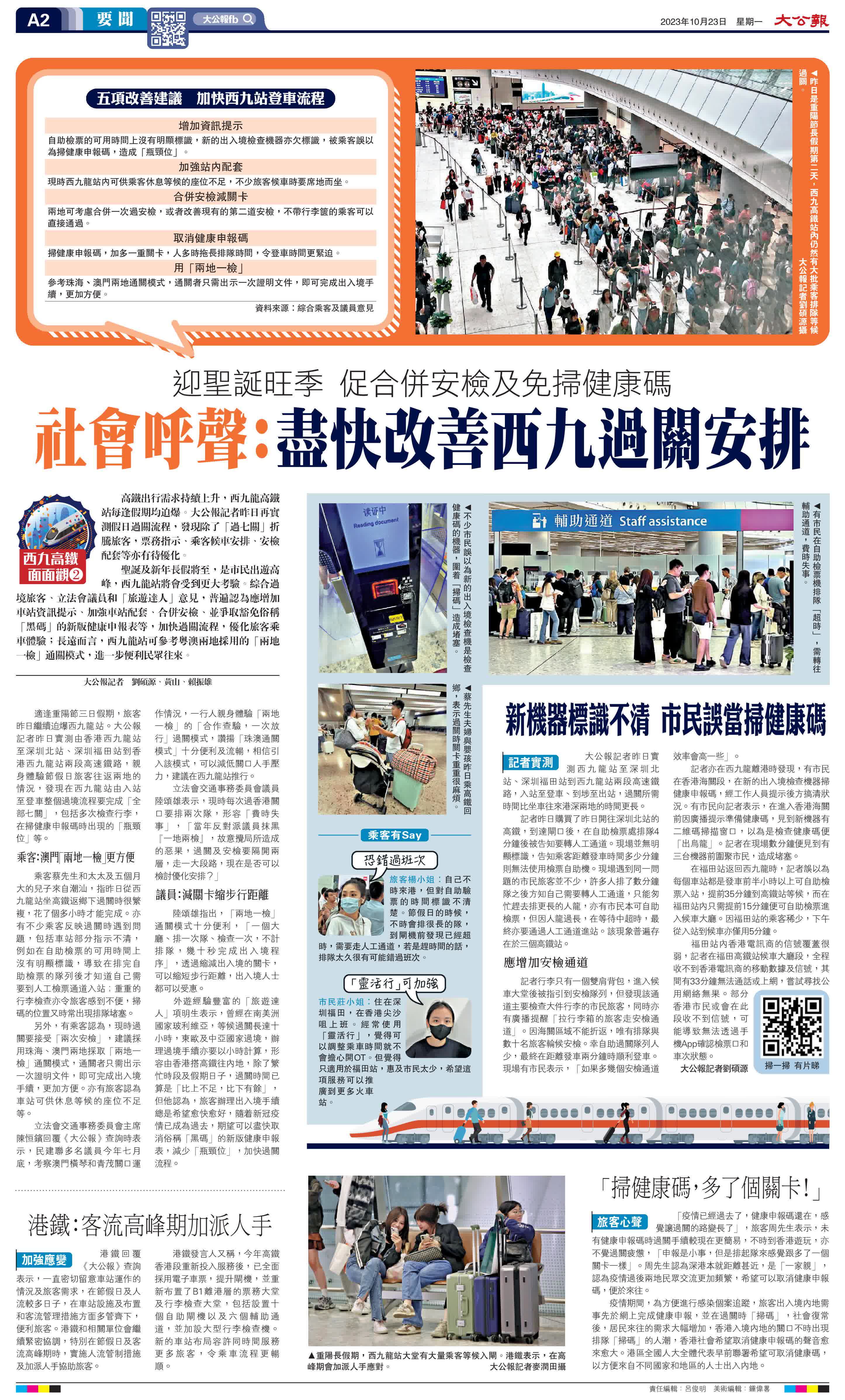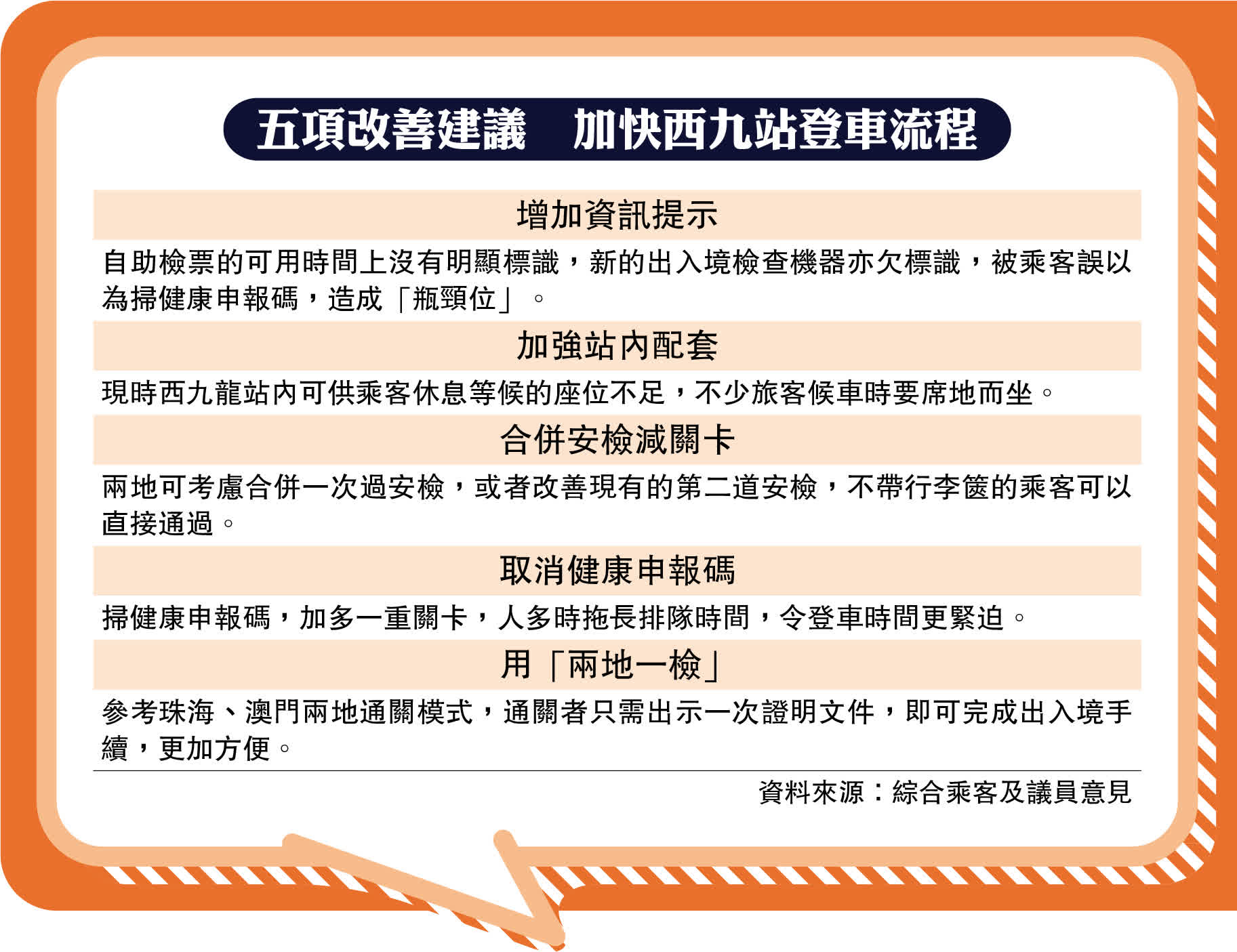聖誕及新年長假將至,是市民出遊高峰,西九龍站將會受到更大考驗。綜合過境旅客、立法會議員和「旅遊達人」意見,普遍認為應增加車站資訊提示、加強車站配套、合併安檢、並爭取豁免俗稱「黑碼」的新版健康申報表等,加快過關流程,優化旅客乘車體驗;長遠而言,西九龍站可參考粵澳兩地採用的「兩地一檢」通關模式,進一步便利民眾往來。