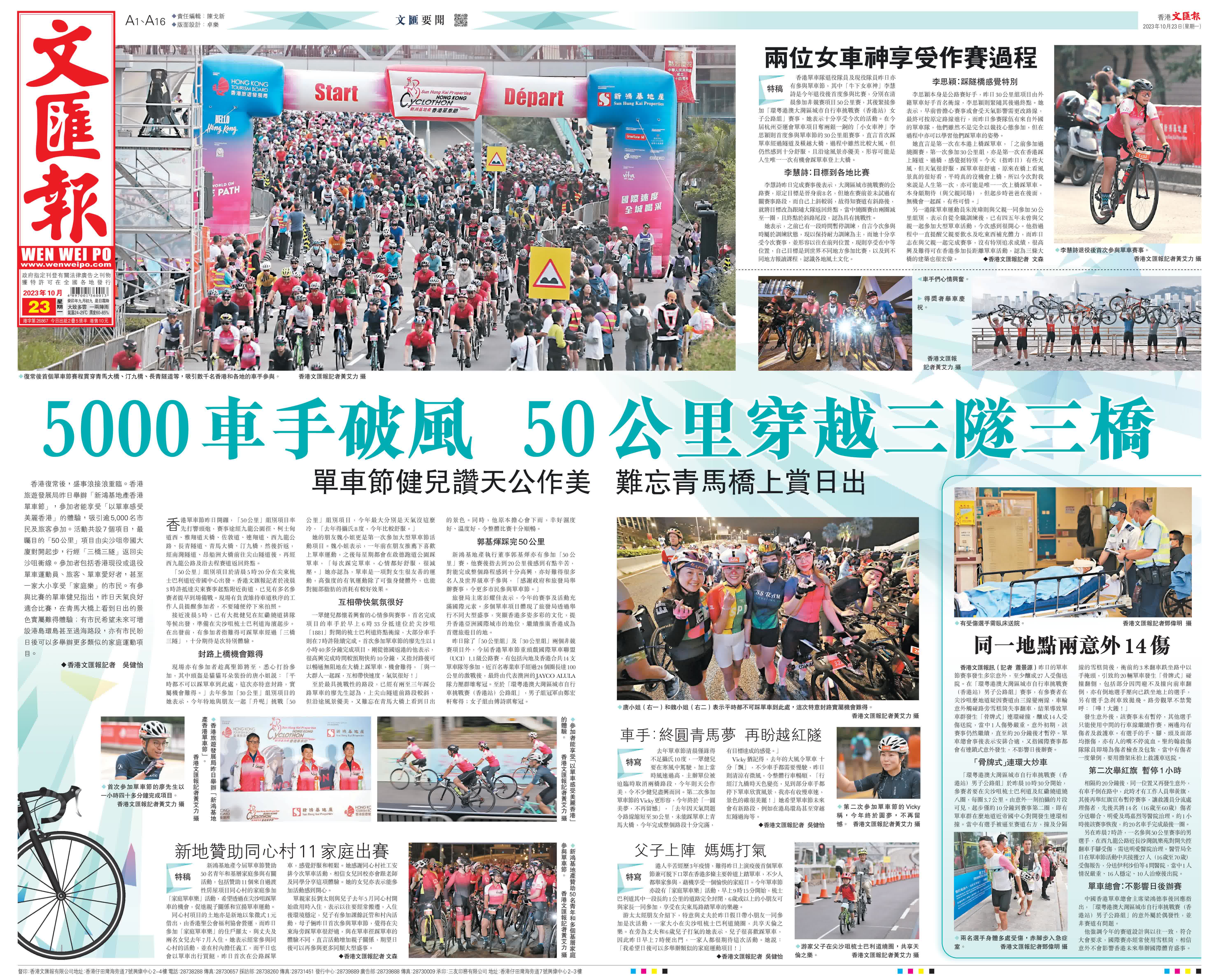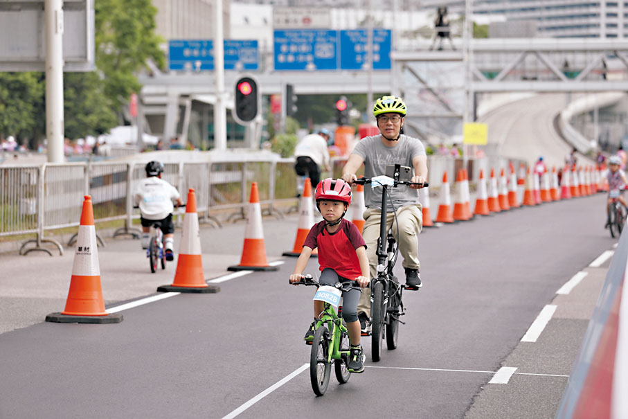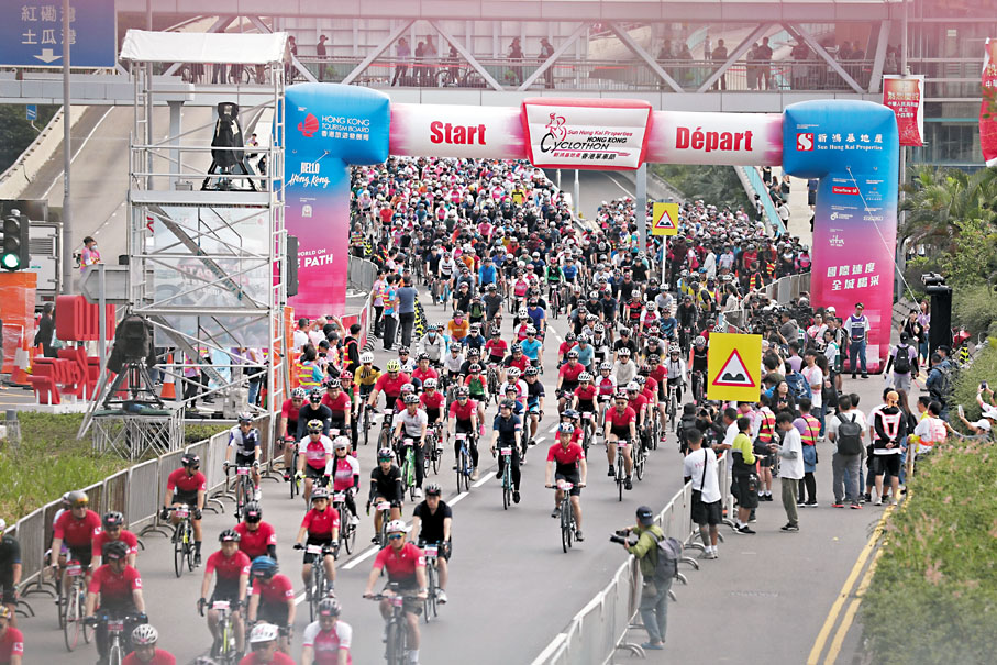 (香港文匯報記者 吳健怡 蕭景源 文森)香港復常後,盛事浪接浪重臨。香港旅遊發展局昨日舉辦「新鴻基地產香港單車節」,參加者能享受「以單車感受美麗香港」的體驗,吸引逾5,000名市民及旅客參加。活動共設7個項目,最矚目的「50公里」項目由尖沙咀帝國大廈對開起步,行經「三橋三隧」返回尖沙咀衝線。參加者包括香港現役或退役單車運動員、旅客、單車愛好者,甚至一家大小享受「家庭樂」的市民。有參與比賽的單車健兒指出,昨日天氣良好適合比賽,在青馬大橋上看到日出的景色實屬難得體驗;有市民希望未來可增設港島環島甚至過海路段,亦有市民盼日後可以多舉辦更多類似的家庭運動項目。
