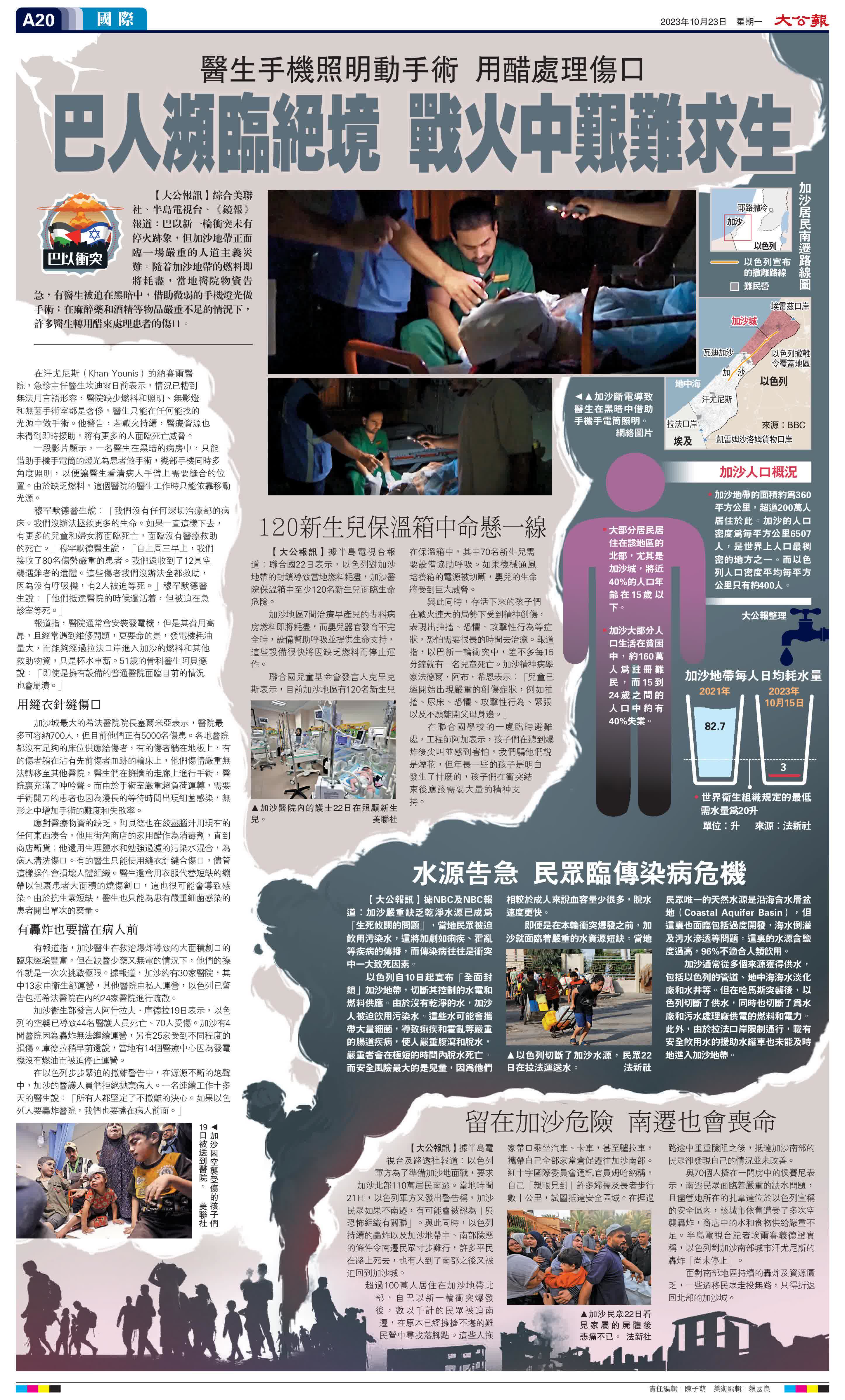 大公報綜合美聯社、NBC、半島電視台、路透社、《鏡報》報道:巴以新一輪衝突未有停火跡象,但加沙地帶正面臨一場嚴重的人道主義災難。隨着加沙地帶的燃料即將耗盡,當地醫院物資告急,有醫生被迫在黑暗中,借助微弱的手機燈光做手術;在麻醉藥和酒精等物品嚴重不足的情況下,許多醫生轉用醋來處理患者的傷口。