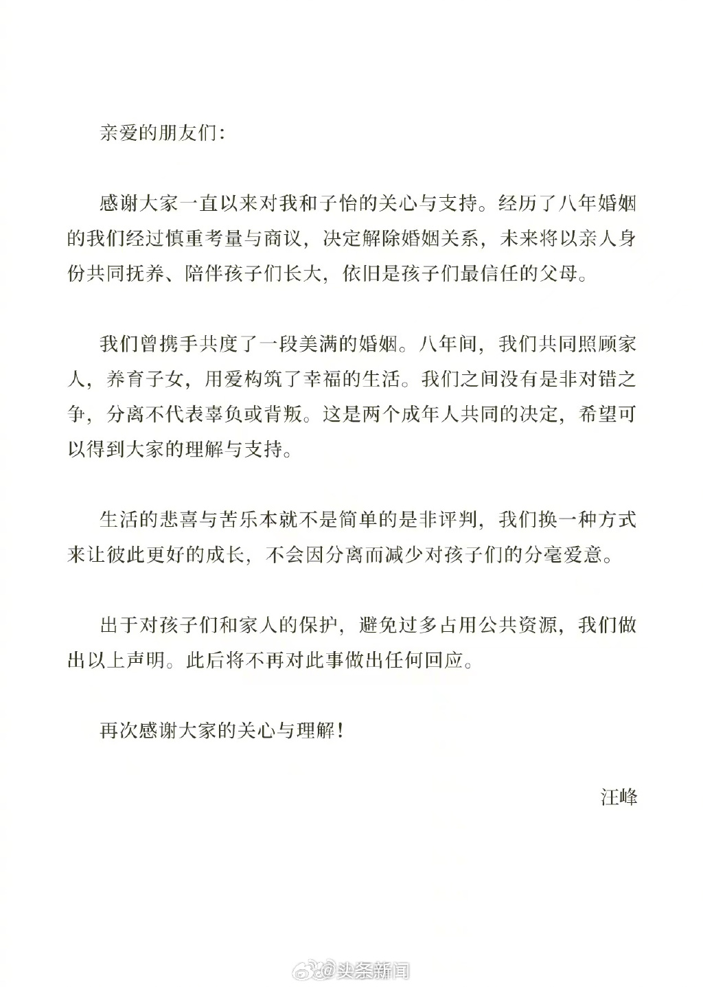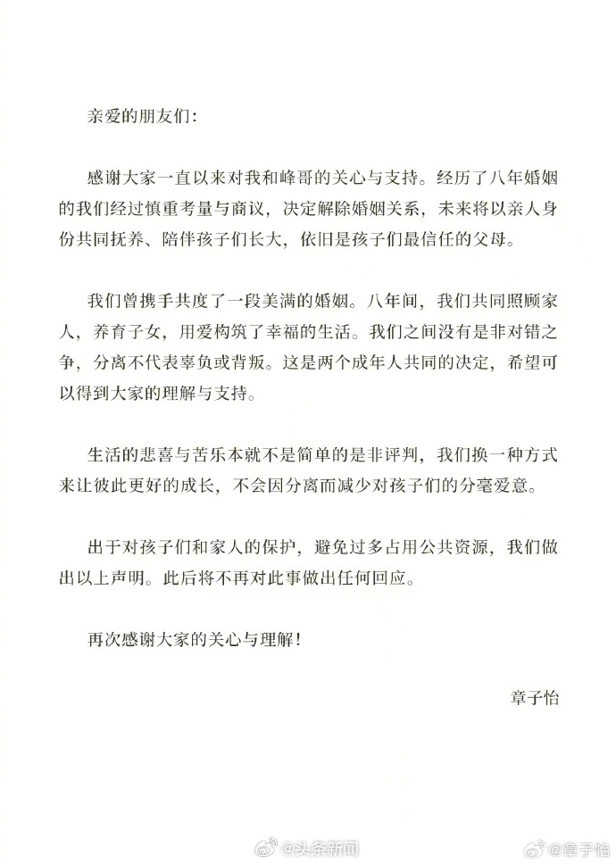 大公文匯全媒體報道,今日(23日)下午,國際影后章子怡與內地歌手汪峰於同一時間發布離婚聲明,官宣八年婚姻終結:「經歷了八年婚姻的我們經過慎重考量與商議,決定解除婚姻關係,未來將以親人身份共同撫養、陪伴孩子們長大。」