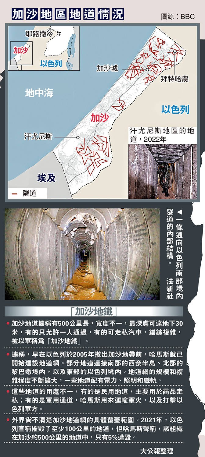 據大公報綜合《德國之聲》、半島電視台報道:在本輪巴以衝突,被稱為「加沙地鐵」的地道網絡,或將成為了影響戰事的關鍵因素之一。據稱該地道網長達500公里,覆蓋整個加沙地帶如同迷宮,除了便於哈馬斯進行軍事行動,同時還為加沙民眾提供了一條獲取以色列封鎖線外物資的道路,成為了加沙的「命脈」。儘管以軍過去曾多次動用傳感器和轟炸等手段摧毀地道,但據稱效果不彰。如果以色列軍隊進入加沙進行地面戰,他們將不得不在陌生環境下,面對錯綜複雜的地道網絡,作戰風險極大。