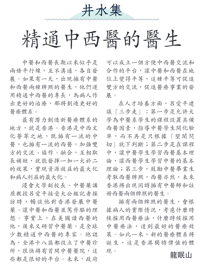 浸會大學副校長、中醫藥講座教授呂愛平接受大公報記者採訪時,暢談他對香港發展中醫藥、讓中醫和西醫並駕齊驅的理想。事實上,在美國讀西醫的他,後來又研習中醫藥,是全球少數精通中西醫的專家。他認為,全港十八區都設立了中醫診所,很快將有首間中醫醫院,這些都是很好的平台。未來,政府可以成立一個方便中西醫交流和合作的平台,讓中醫和西醫在地位上變得平等,這種平等可促進雙方的交流,促進醫療事業的發展。