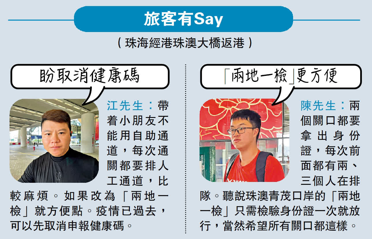 徐先生昨日在港珠澳大橋過關回港,他說不時經珠港兩地旅遊,認為每次通關都需出示兩個身份證,較為麻煩,不過自助通道讀取資料較快,「人潮少點都會快一些,人多就要排兩次,較費時」。