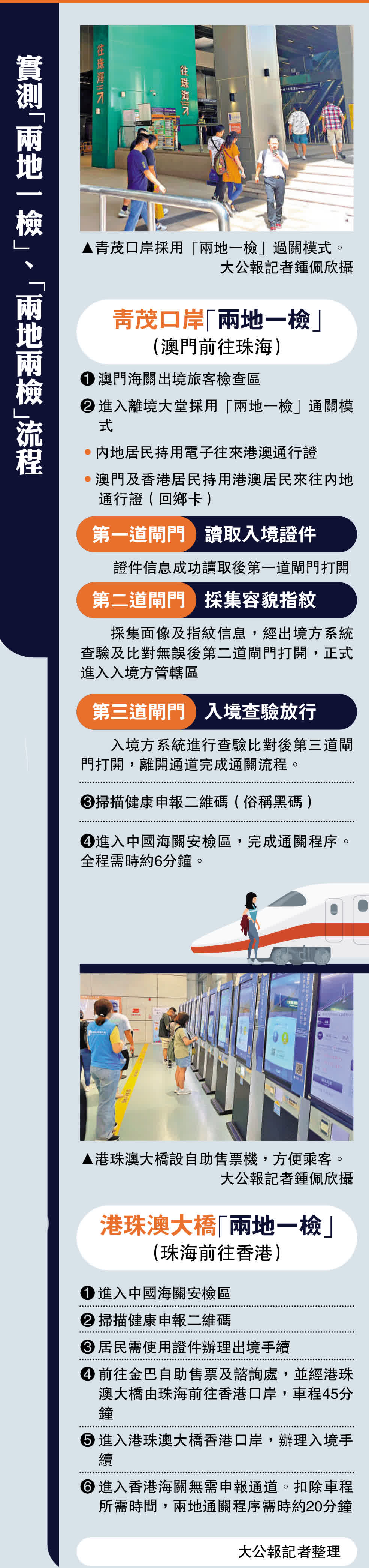 高鐵西九龍站過關程序繁複,在一個站內出境入境等共要過七關,十分折騰,不少市民希望簡化流程。澳門早於2018年,已在港珠澳大橋澳珠旅檢大廳實施「兩地一檢」通關模式,隨後橫琴口岸及青茂口岸相繼落成。大公報記者昨日在青茂口岸,由澳門往珠海,實測「兩地一檢」過關程序,只需排一次隊就完成通關程序,包括兩地海關檢查、掃描健康申報二維碼,以及自助通關流程,全程只需六分鐘。