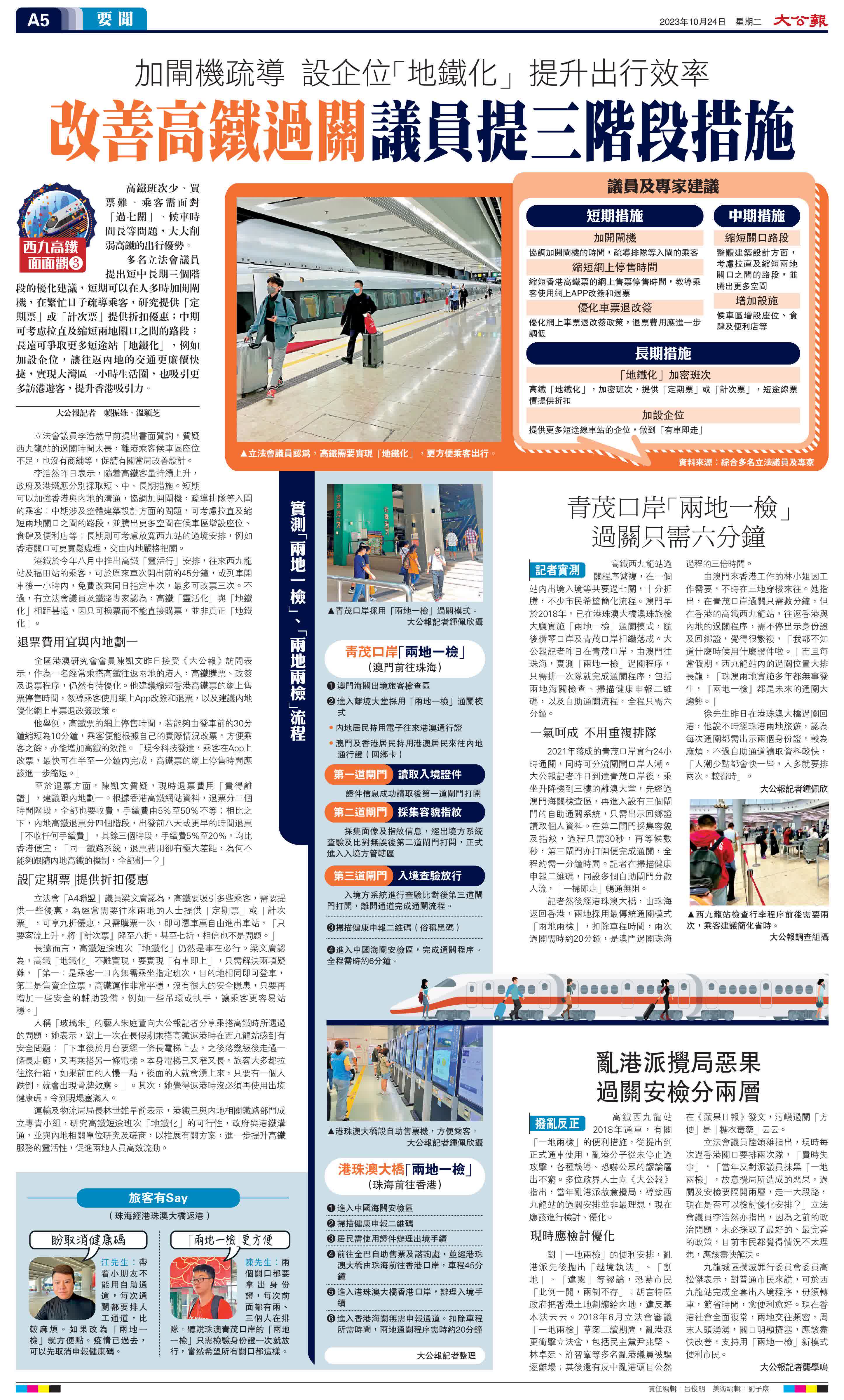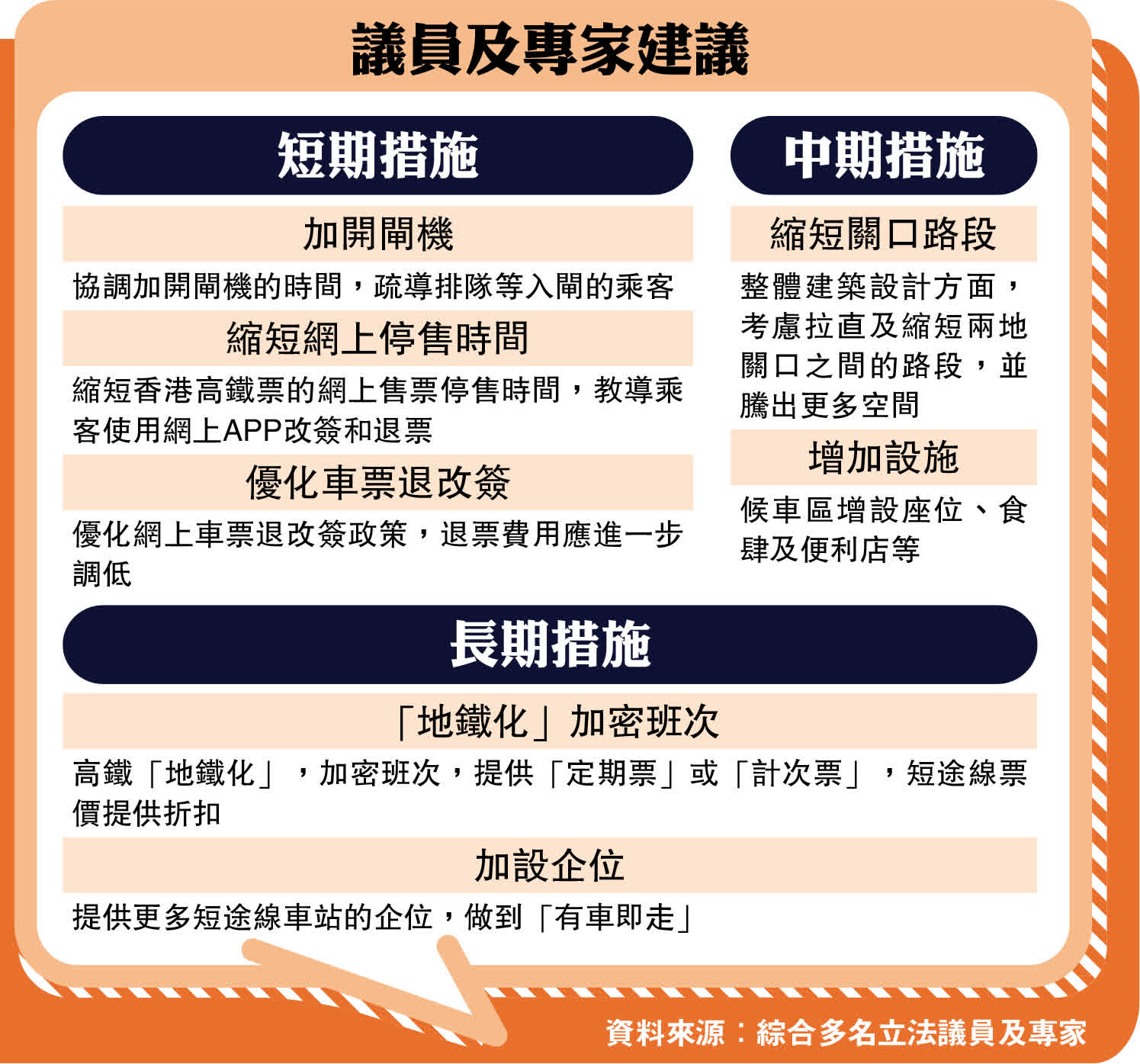 多名立法會議員提出短中長期三個階段的優化建議,短期可以在人多時加開閘機,在繁忙日子疏導乘客,研究提供「定期票」或「計次票」提供折扣優惠;中期可考慮拉直及縮短兩地關口之間的路段;長遠可爭取更多短途站「地鐵化」,例如加設企位,讓往返內地的交通更廉價快捷,實現大灣區一小時生活圈,也吸引更多訪港遊客,提升香港吸引力。