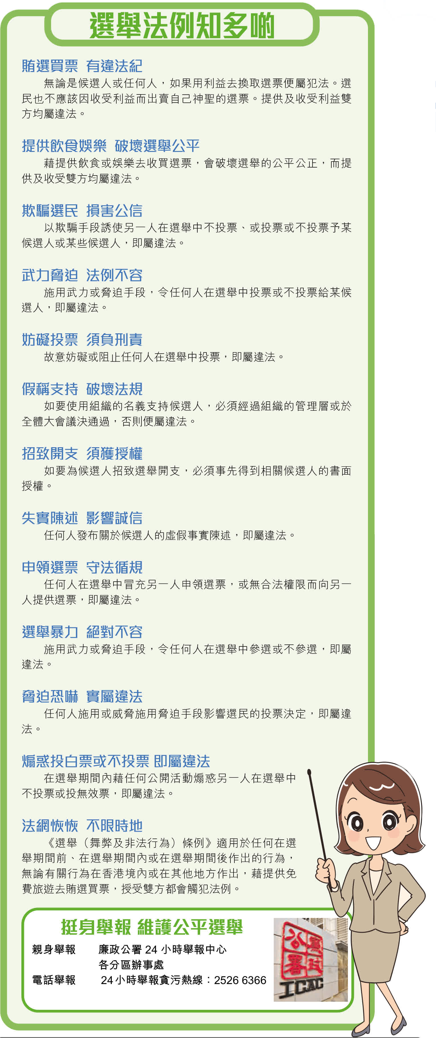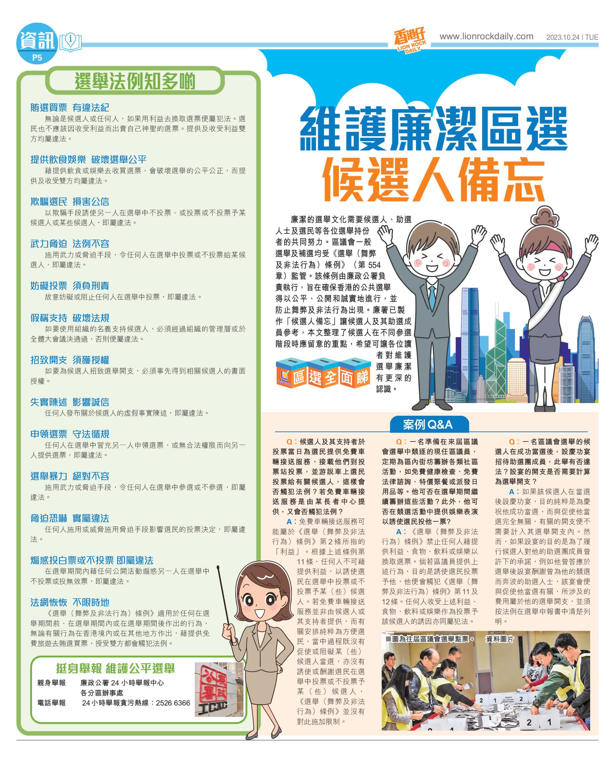 香港仔報道,廉潔的選舉文化需要候選人、助選人士及選民等各位選舉持份者的共同努力。區議會一般選舉及補選均受《選舉(舞弊及非法行為)條例》(第 554 章)監管。該條例由廉政公署負責執行,旨在確保香港的公共選舉得以公平、公開和誠實地進行,並防止舞弊及非法行為出現。廉署已製作「候選人備忘」讓候選人及其助選成員參考,本文整理了候選人在不同參選階段時應留意的重點,希望可讓各位讀者對維護選舉廉潔有更深的認識。