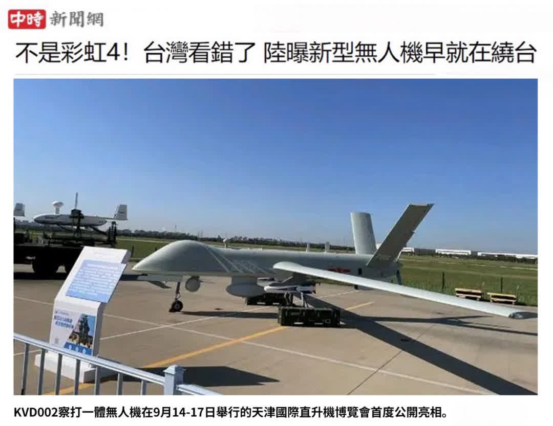 「不是彩虹-4!台灣看錯了」,台灣《中國時報》最近的一篇報道指出,台防務部門自去年9月開始頻繁通報繞島巡航的解放軍察打一體無人機彩虹-4,有可能不是本尊。報道引用分析人士的話指出,外形設計酷似彩虹-4、新亮相的解放軍KVD002察打一體無人機很可能從2022年起,就參與了繞台巡航與軍演。台防務部門由於不掌握KVD002這種型號,極有可能錯把KVD002當成了彩虹-4。相關報道也令島內各界懷疑,台軍是否還存在其他掌握錯的情況。