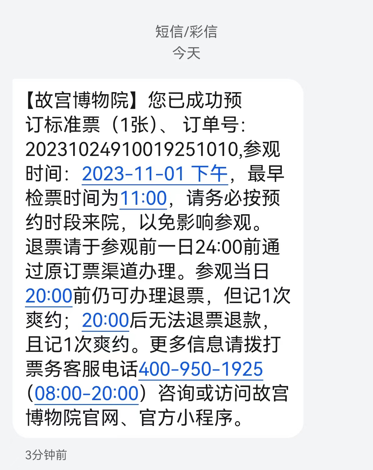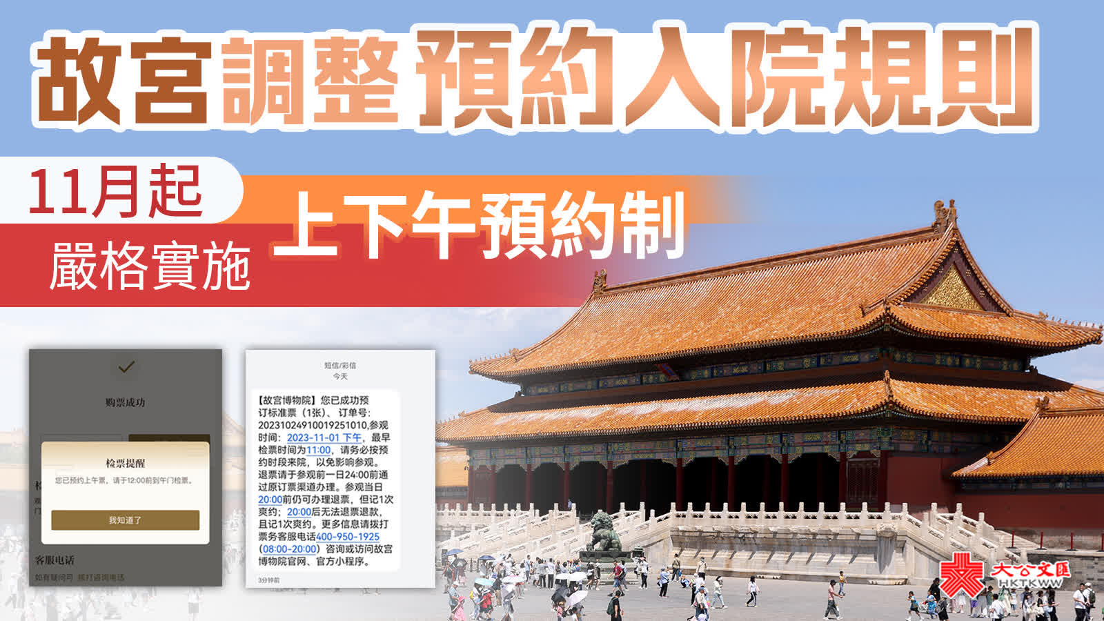 (大公文匯網記者 江鑫嫻)故宮博物院24日發布公告,從今年11月1日起,也就是參觀接待淡季開始,進一步優化分時段預約的措施:上午預約上午進,入院截止時間為中午12時;下午票入院時間從11時開始。如果上午場觀眾在12點後檢票,現場會提示「已過期」;下午場觀眾在11點前檢票則會提示「未生效」。不論預約時間是上午還是下午,未能如期參觀的觀眾都可以在參觀當日20時前自主在小程序中申請退票,會記一次爽約,超過20時就無法退票。故宮博物院保衛處處長王波表示,隨着檢票入院時間的進一步優化,高峰客流將得到分散,同時觀眾的參觀體驗也將有所上升。