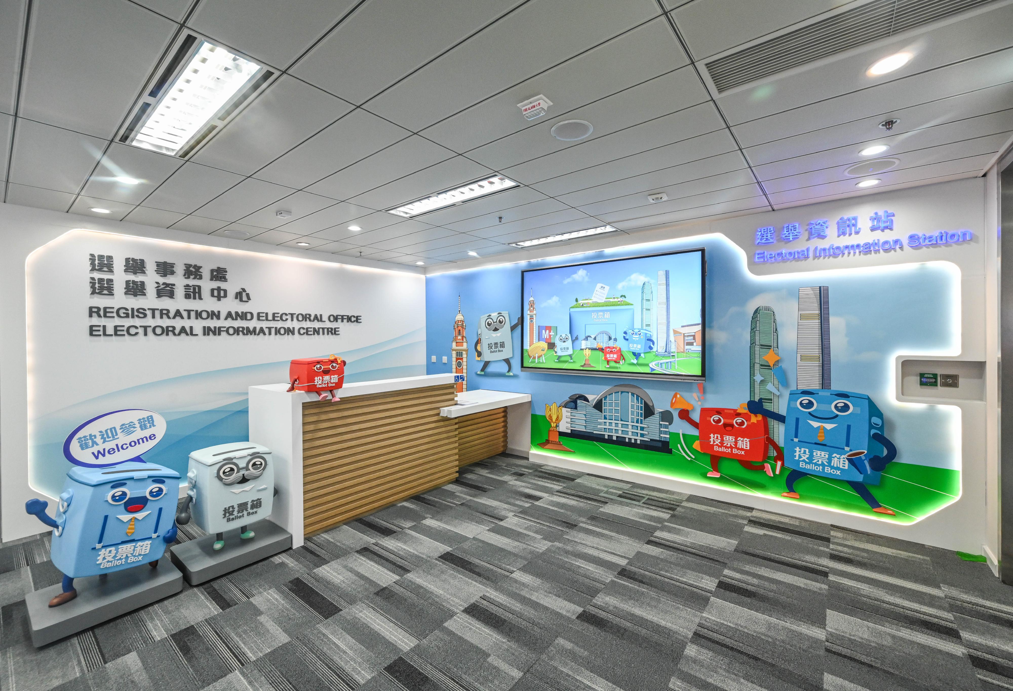為配合新中心啟用,選舉事務處製作以投票箱為設計意念的吉祥物「票箱家族」——「藍小寶」「紅小寶」和「白爺爺」,並為他們製作一系列WhatsApp貼圖和紀念品。參觀者有機會獲贈「票箱家族」精美紀念品,亦可在拍照區與「票箱家族」拍照留念,還有機會可以一試身手,在「夾公仔機」把「票箱家族」帶回家。陸啟康法官期望生動可愛的「票箱家族」,可加強選舉事務處的辨識度,提升市民對選舉工作的關注。