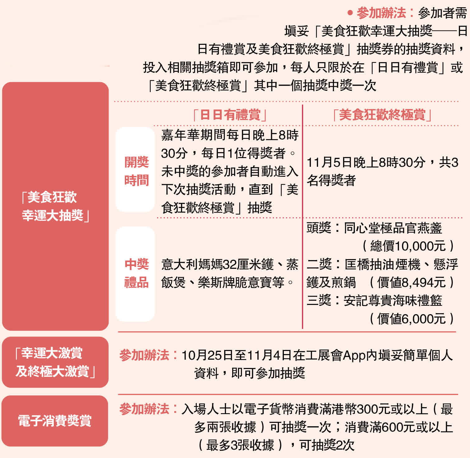 今屆香港美食嘉年華門票由4元加至5元,開放時間延長一小時,晚上七時後免費入場,現場不設現金售票處。場內將有300個攤位,售賣美食、飲料及廚具等多種產品,有「1蚊」商品和大量低於四折的優惠產品。展期每日下午1時、3時、5時及7時,廠商會派送免費雪糕,每日共送出800份,萬聖節當日亦會舉辦主題活動和相關工作坊。