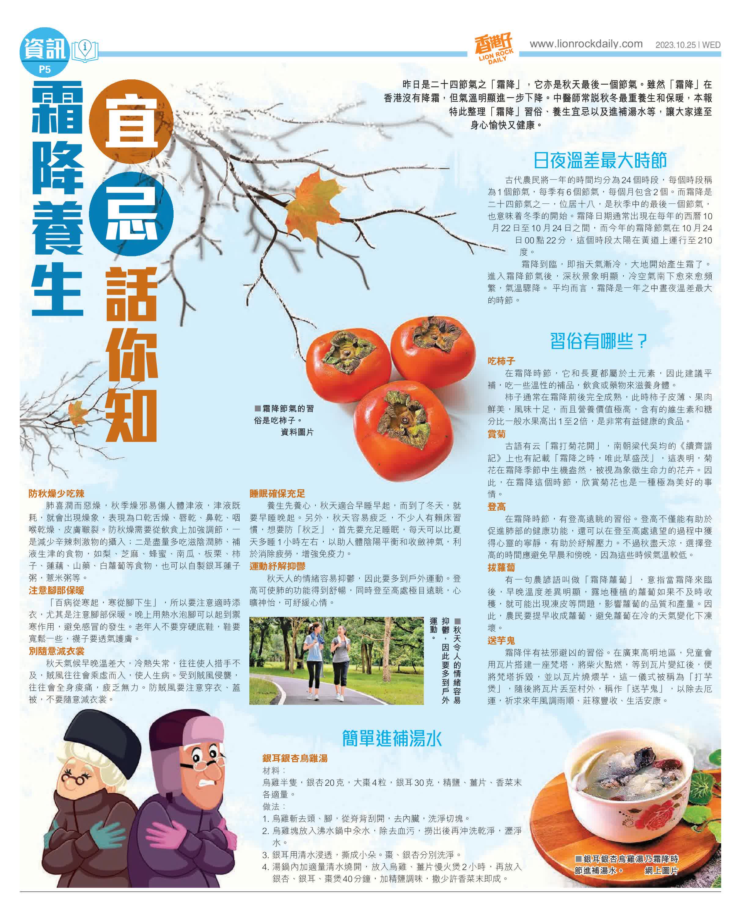 香港仔報道,昨日是二十四節氣之「霜降」,它亦是秋天最後一個節氣。雖然「霜降」在香港沒有降霜,但氣溫明顯進一步下降。中醫師常說秋冬最重養生和保暖,本報特此整理「霜降」習俗、養生宜忌以及進補湯水等,讓大家達至身心愉快又健康。