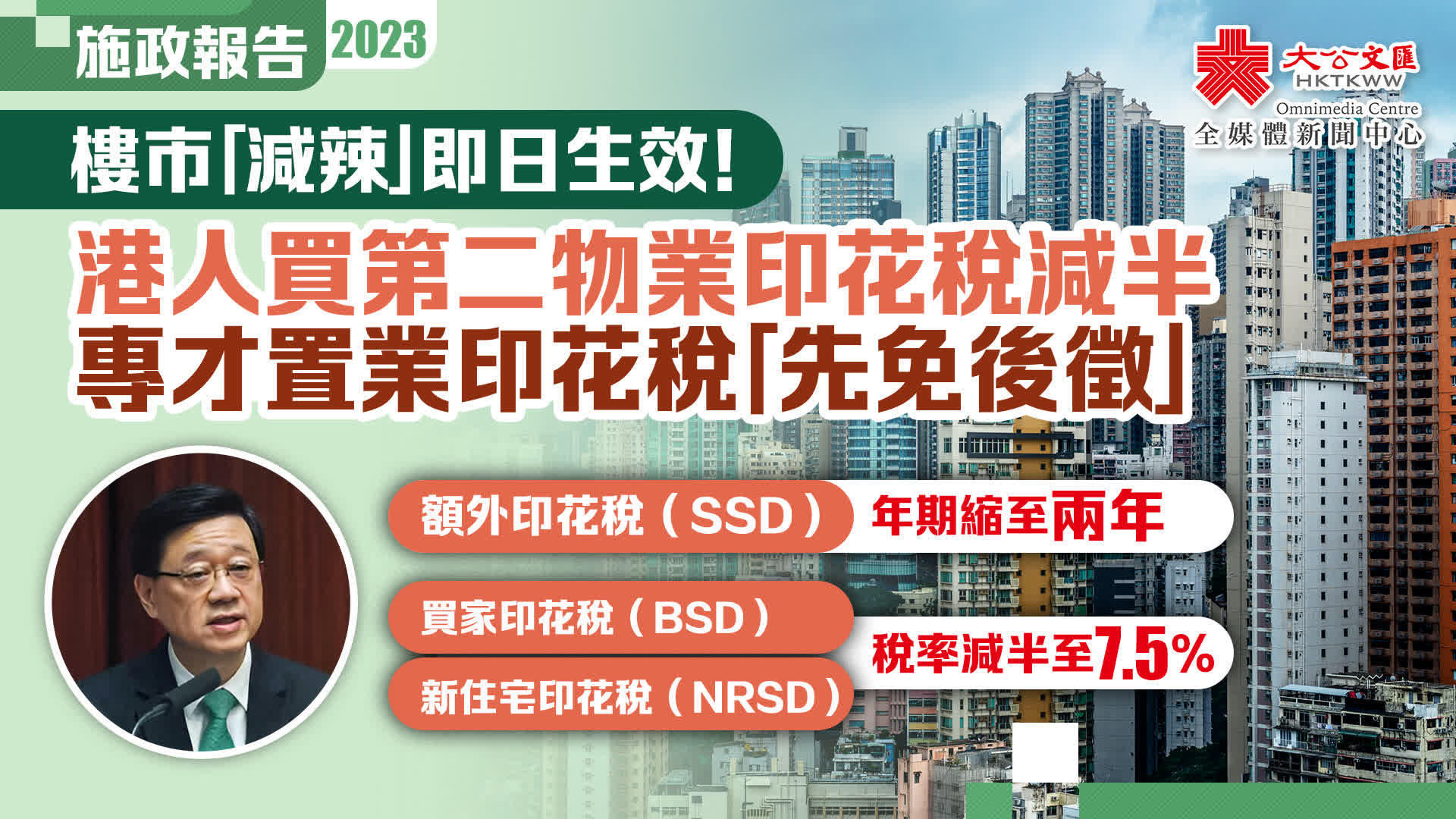大公文匯全媒體記者報道,行政長官李家超今日(25日)發表任內第二份施政報告,宣布下調股票印花稅至0.1%、縮短樓市額外印花稅(SSD)年期至兩年,及買家印花稅(BSD)和新住宅印花稅(NRSD)的稅率減半等刺激措施。一文睇清樓市及股市的最新政策!