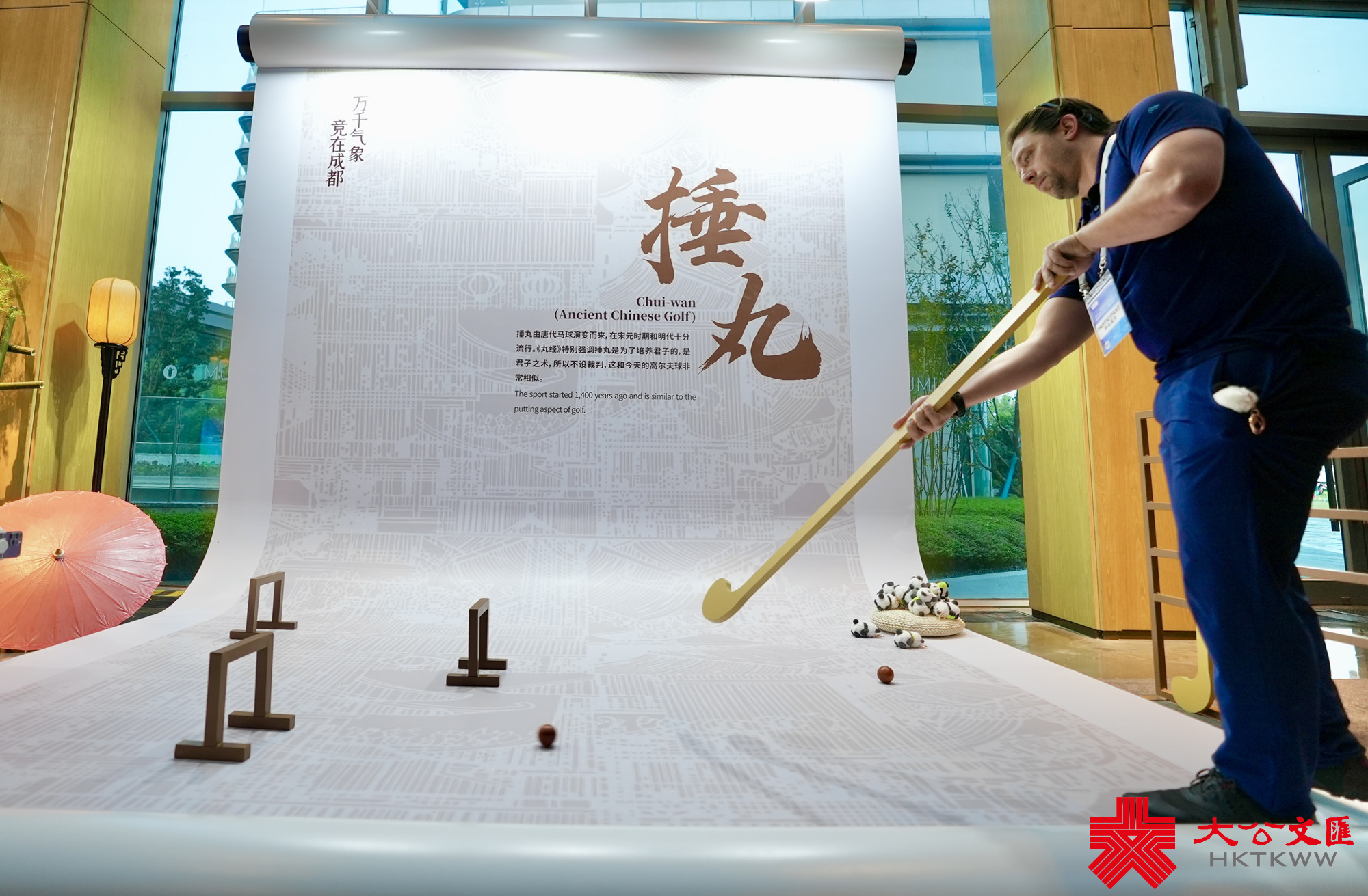 走進會場,一股濃濃的中國傳統文化氣息撲面而來。在「萬千氣象·競在成都」主題下,合影牆上大型圖捲讓來賓們紛紛駐足觀賞。這幅畫卷描繪了中國古代各種體育競技表演的場面,裏面有射箭、蹴踘、馬球、捶丸、投壺等中國古代體育活動,體現了中國古代體育運動遊戲的豐富多彩。