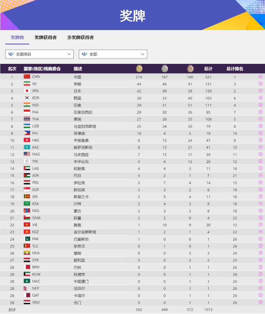 據新華社報道,杭州亞殘運會在28日迎來最後一個比賽日,當天共決出46枚金牌,中國隊收穫其中的18枚,金牌總數達到214枚,高居榜首。伊朗隊和日本隊分別以44金和42金位列第二、第三。