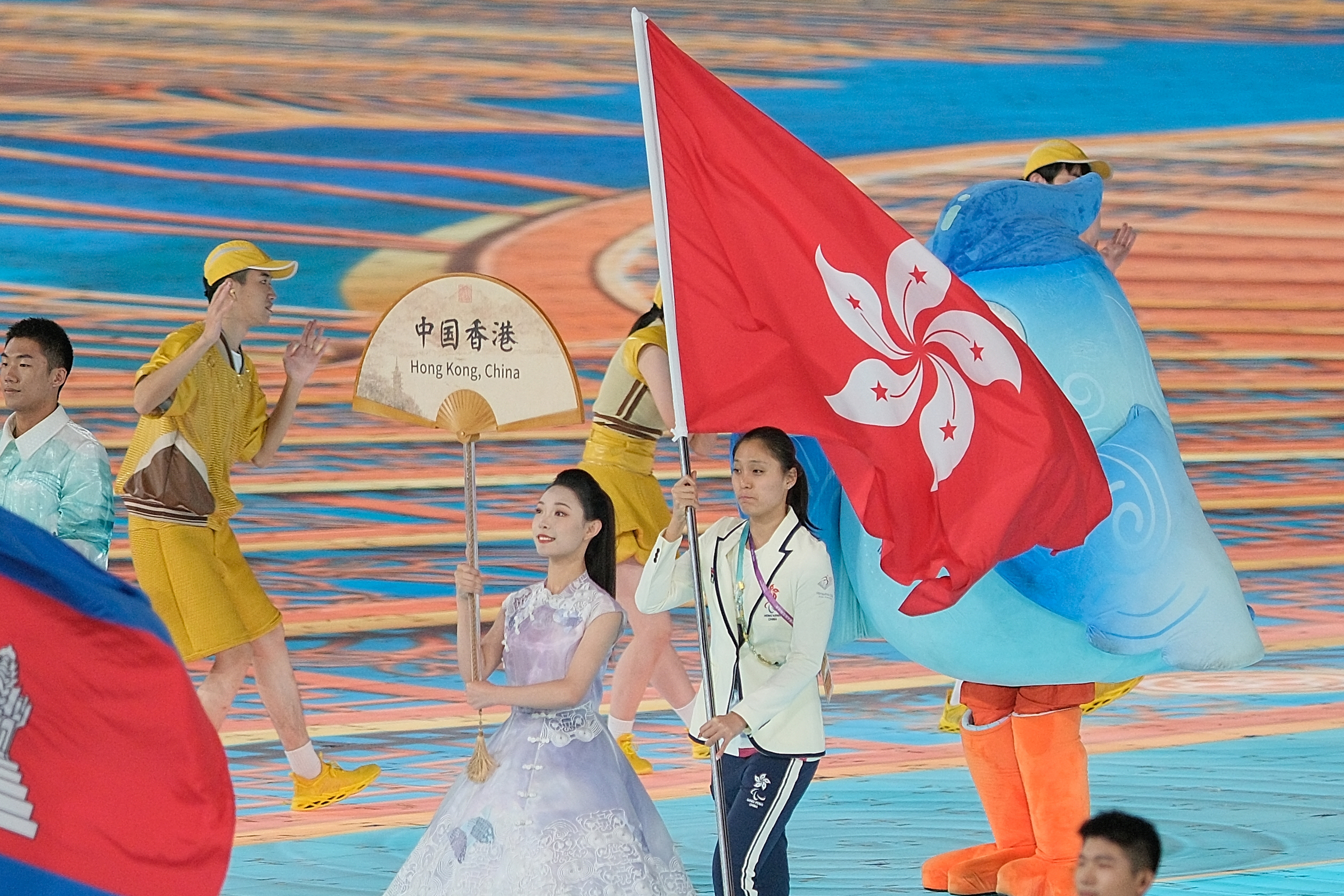 大公文匯全媒體報道,今晚(28日),杭州第4屆亞殘運會在杭州奧體中心體育場正式閉幕。中國香港代表隊由今屆奪得2金、3銀的游泳代表陳睿琳擔任持旗手,代表港隊以第七隊進場。港隊於7天杭州亞殘運會正式賽事中奪得8金、15銀、24銅共47枚奬牌,位列金牌榜第十。