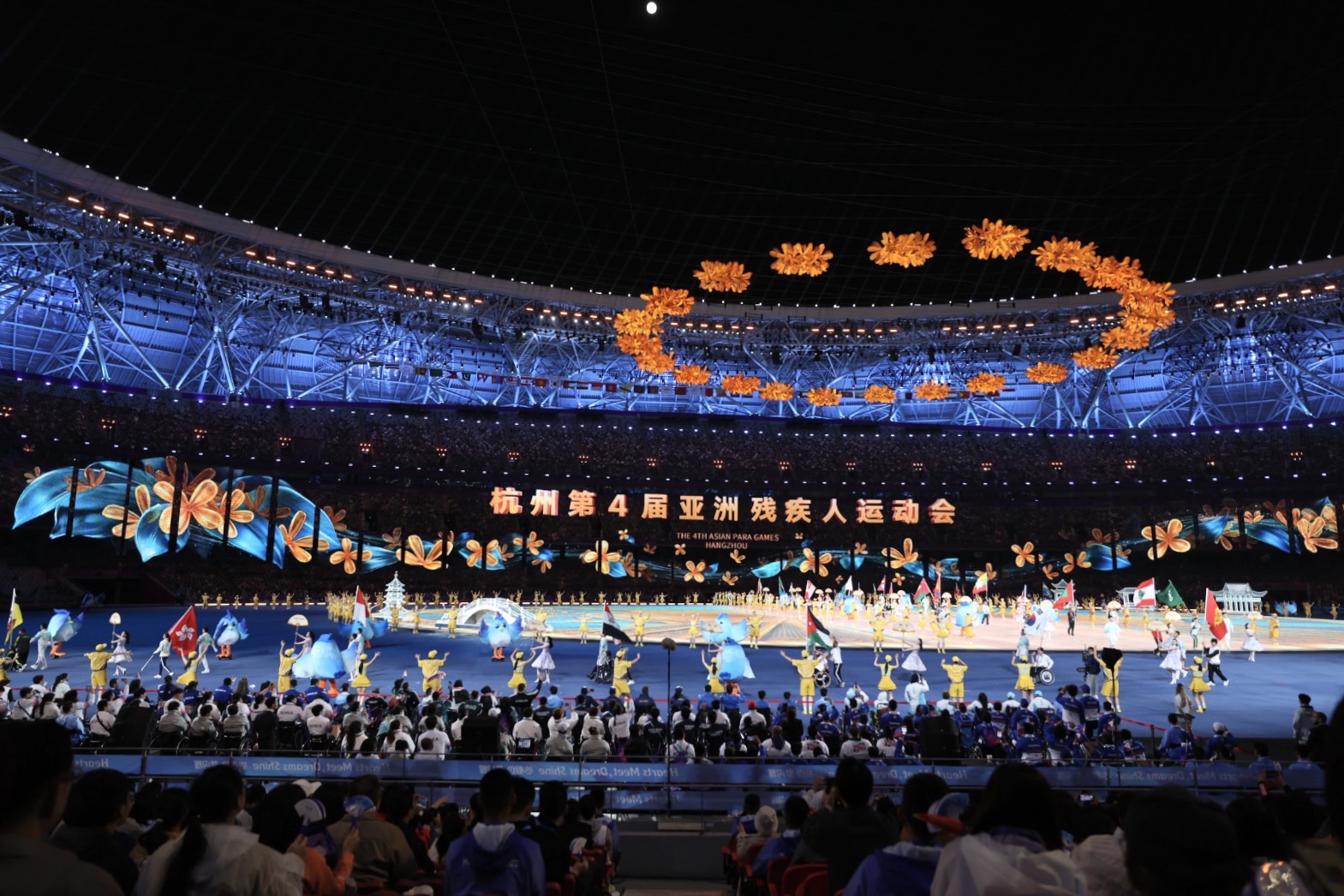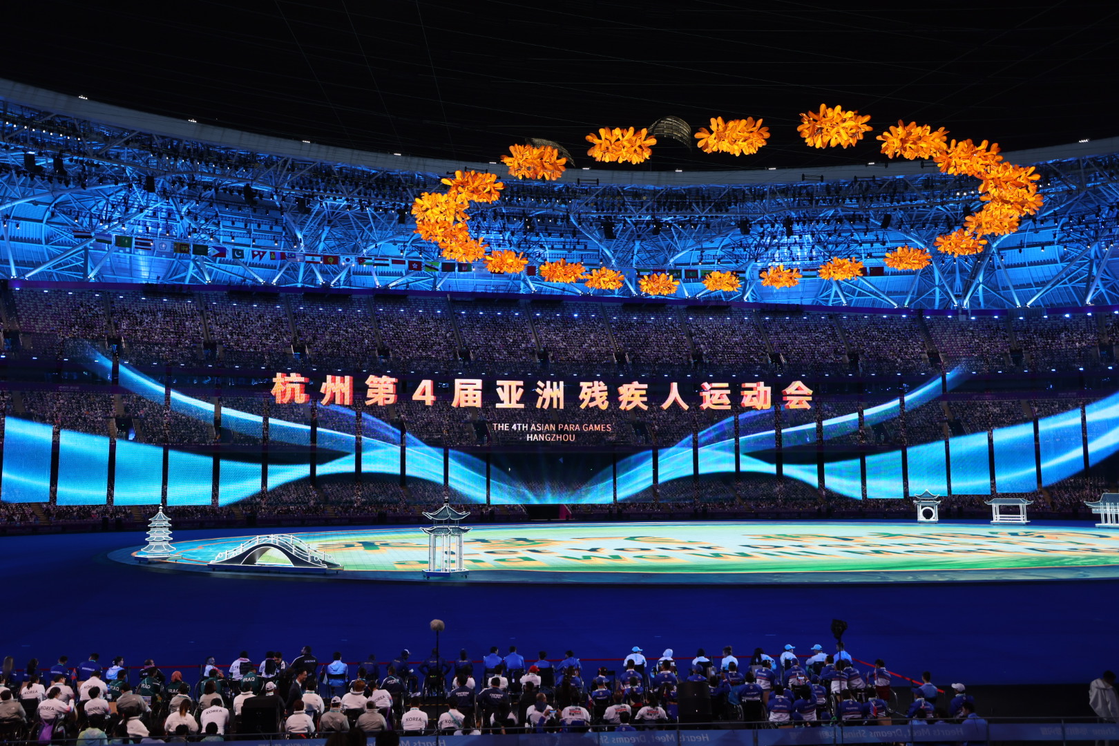 閉幕式以「乘夢飛 再相約」為主題,以《惜別在今宵》《清茶敬遠行》《最憶是杭州》三個表演章節和《你最精彩》《清茶敬遠行》《你最難忘》三個短片的講述,通過「禮」「韻」「情」展現杭州記憶、中國心意和亞洲情誼,體現惺惺相惜之情和殘健共融之情。