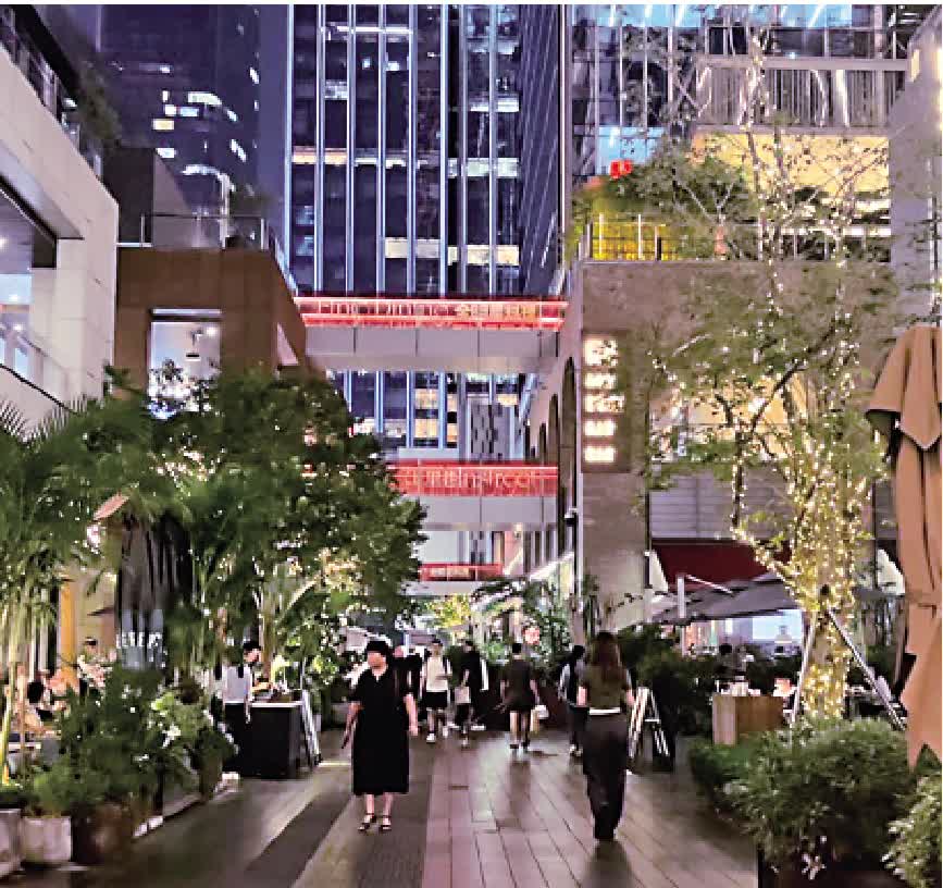 萬象天地商場外的行人路兩旁,有各式服裝店及飲食店,這些店舖會定期更新,保持新鮮感。附近還有露營區域,有奶茶、水煙、咖啡及小酒吧等食店,漫步其中,可細味不同國家特色小吃。不論消費多少,市民均可以坐在露營區域與朋友暢談,欣賞夜空及周邊的燈光設計。記者走在街上,不時有操粵語的人經過,儼如走在香港街頭。