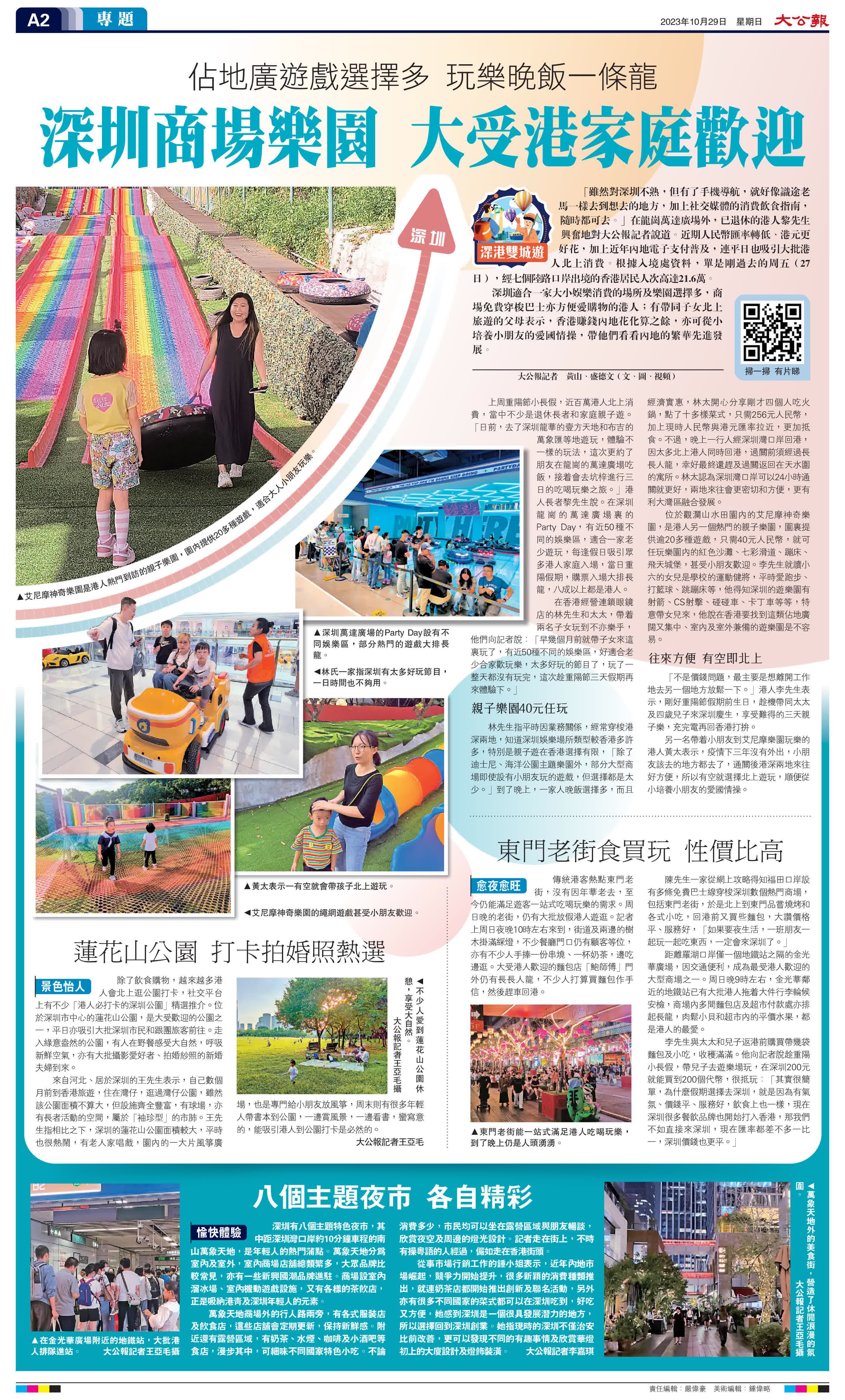 (大公報記者 黃山、盛德文、王亞毛、李嘉琪、伍軒沛、蘇荣)「雖然對深圳不熟,但有了手機導航,就好像識途老馬一樣去到想去的地方,加上社交媒體的消費飲食指南,隨時都可去。」在龍崗萬達廣場外,已退休的港人黎先生興奮地對大公報記者說道。近期人民幣匯率轉低、港元更好花,加上近年內地電子支付普及,連平日也吸引大批港人北上消費。根據入境處資料,單是剛過去的周五(27日),經七個陸路口岸出境的香港居民人次高達21.6萬。