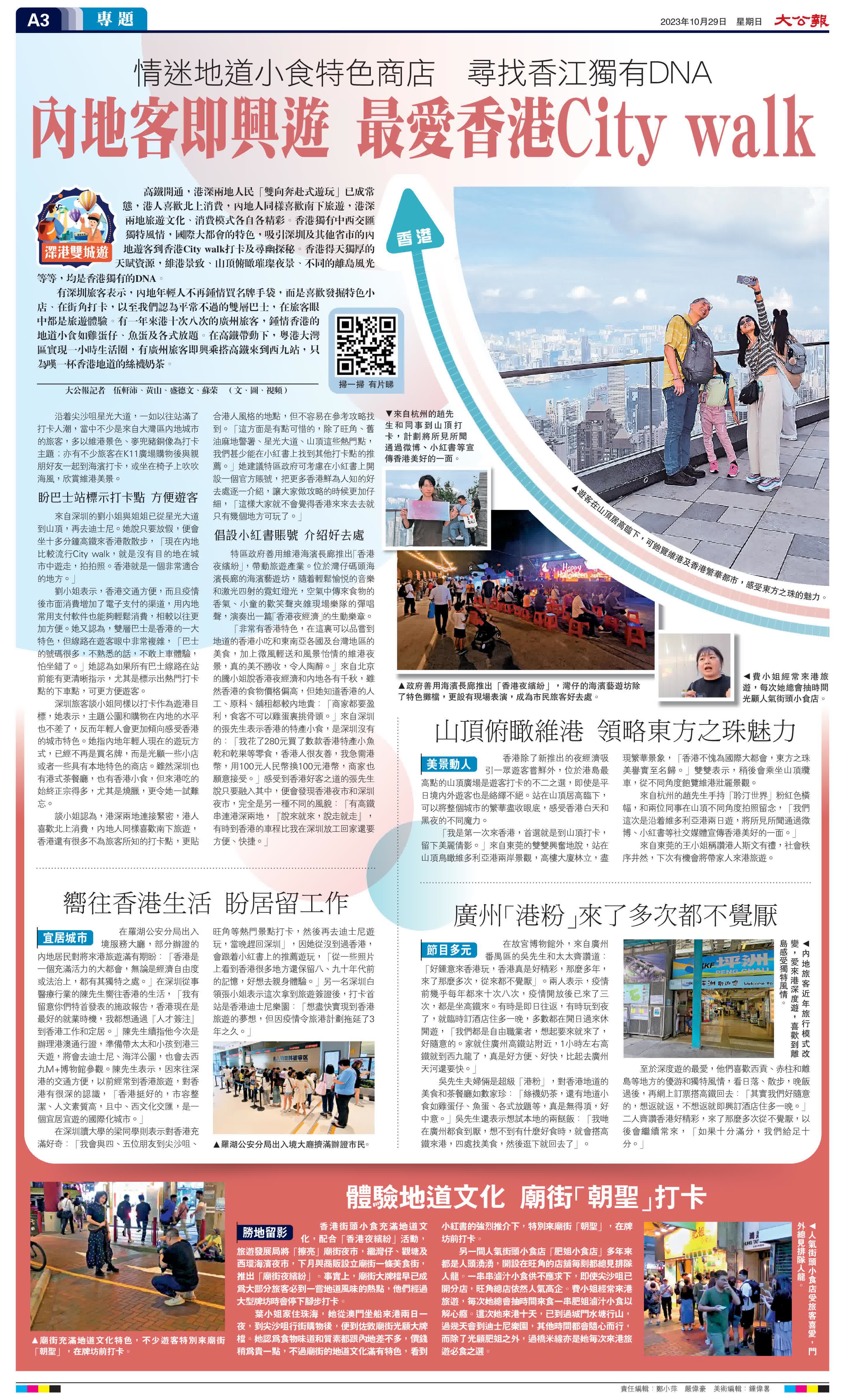 有深圳旅客表示,內地年輕人不再鍾情買名牌手袋,而是喜歡發掘特色小店、在街角打卡,以至我們認為平常不過的雙層巴士,在旅客眼中都是旅遊體驗。有一年來港十次八次的廣州旅客,鍾情香港的地道小食如雞蛋仔、魚蛋及各式放題。在高鐵帶動下,粵港大灣區實現一小時生活圈,有廣州旅客即興乘搭高鐵來到西九站,只為嘆一杯香港地道的絲襪奶茶。