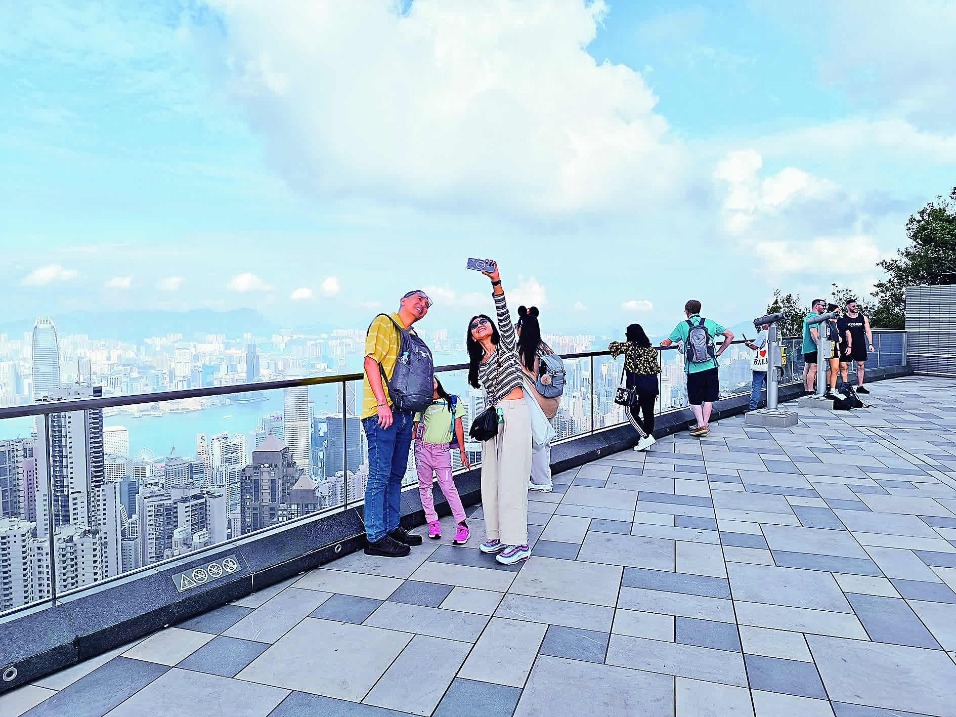 「我是第一次來香港,首選就是到山頂打卡,留下美麗倩影。」來自東莞的雙雙興奮地說,站在山頂鳥瞰維多利亞港兩岸景觀,高樓大廈林立,盡現繁華景象,「香港不愧為國際大都會,東方之珠美譽實至名歸。」雙雙表示,稍後會乘坐山頂纜車,從不同角度飽覽維港壯麗景觀。