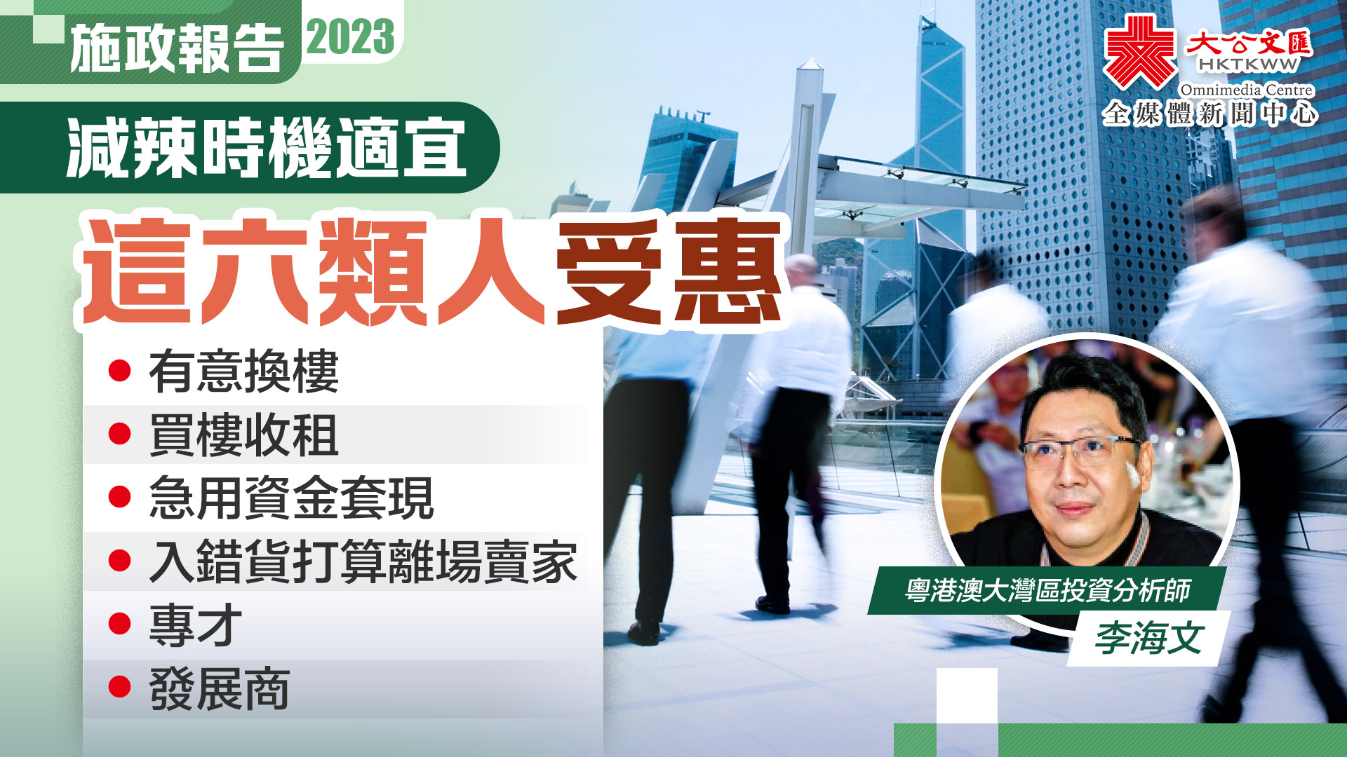 減辣有助支持6類群體,李海文逐一介紹,包括住宅不夠住、想改善生活環境的換樓人群;已有樓,希望再買樓投資收租;急用資金,因SSD縮短至2年而提前賣出套現;之前入錯貨,趁SSD縮短換貨,儘管損手,但長痛不如短痛,重新覓好貨;因「先免後徵」吸引上車的專才人群;受惠政策降低成本的發展商,因以往可能送印花稅給買家。