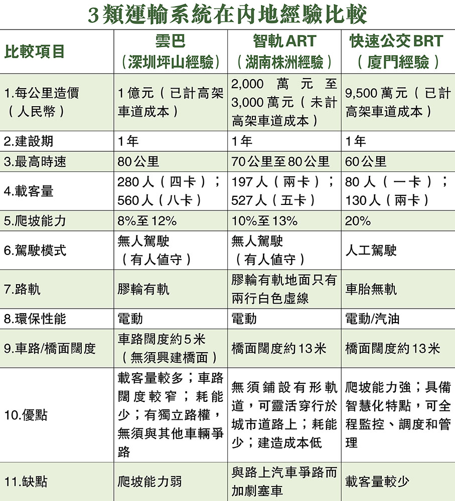 林世雄透露,局方目前考慮的3種綠色捷運系統有不同特性,有些爬坡能力較強,有些載客能力高,造價亦各有差別,因此需經過系統研究。