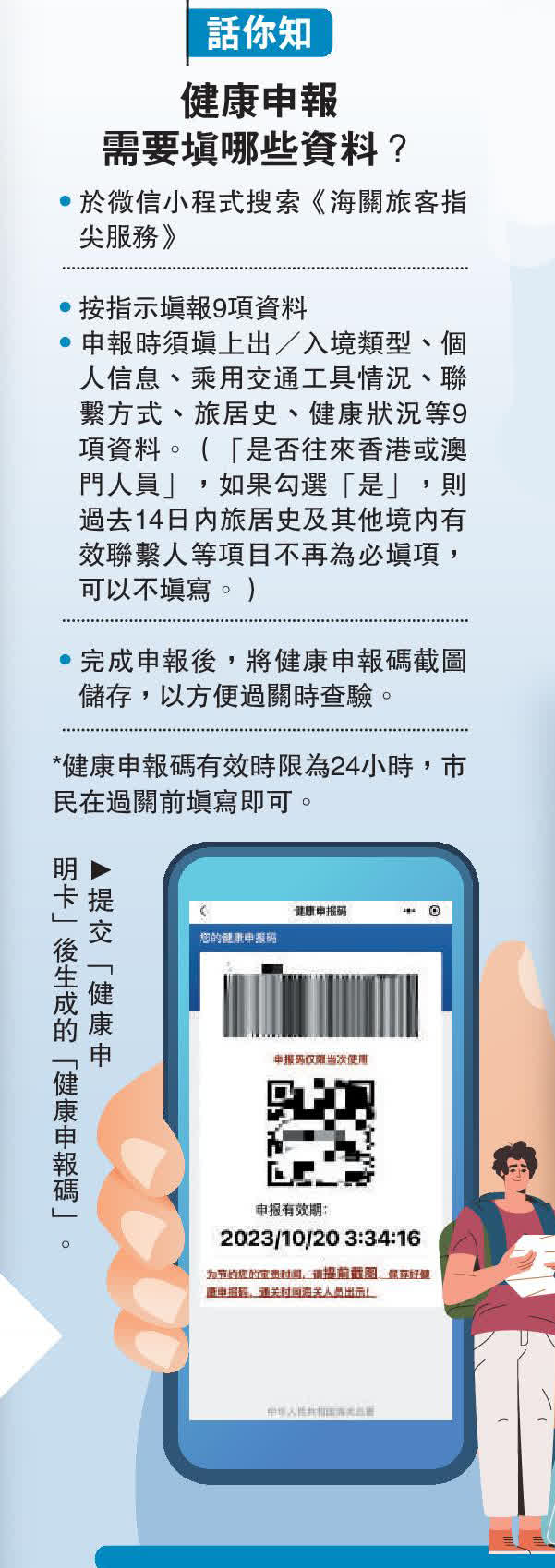 (大公報記者 石華 伍軒沛 劉碩源 王亞毛)自2月6日香港與內地全面恢復通關後,北上南下「雙向奔赴」,兩地人員往來交流日益密切。但一直以來港人入境內地仍需預先填寫「健康申明卡」,令經常往返兩地的市民感到不便。29日網絡上有消息稱:本周三(11月1日)零時起將取消出入境健康申報,記者向深圳海關以及深圳市口岸辦求證,均表示暫未收到海關總署通知。當日,有市民及遊客經西九龍站過關時已無需掃碼,但蓮塘/香園圍口岸、深圳灣口岸仍如常需要掃碼申報。全國人大常委會委員李慧琼向海關總署求證後表示,相關安排正進入審批的最後階段,對11月1日正式取消健康申報碼充滿信心,但詳情要以海關總署公布為準。