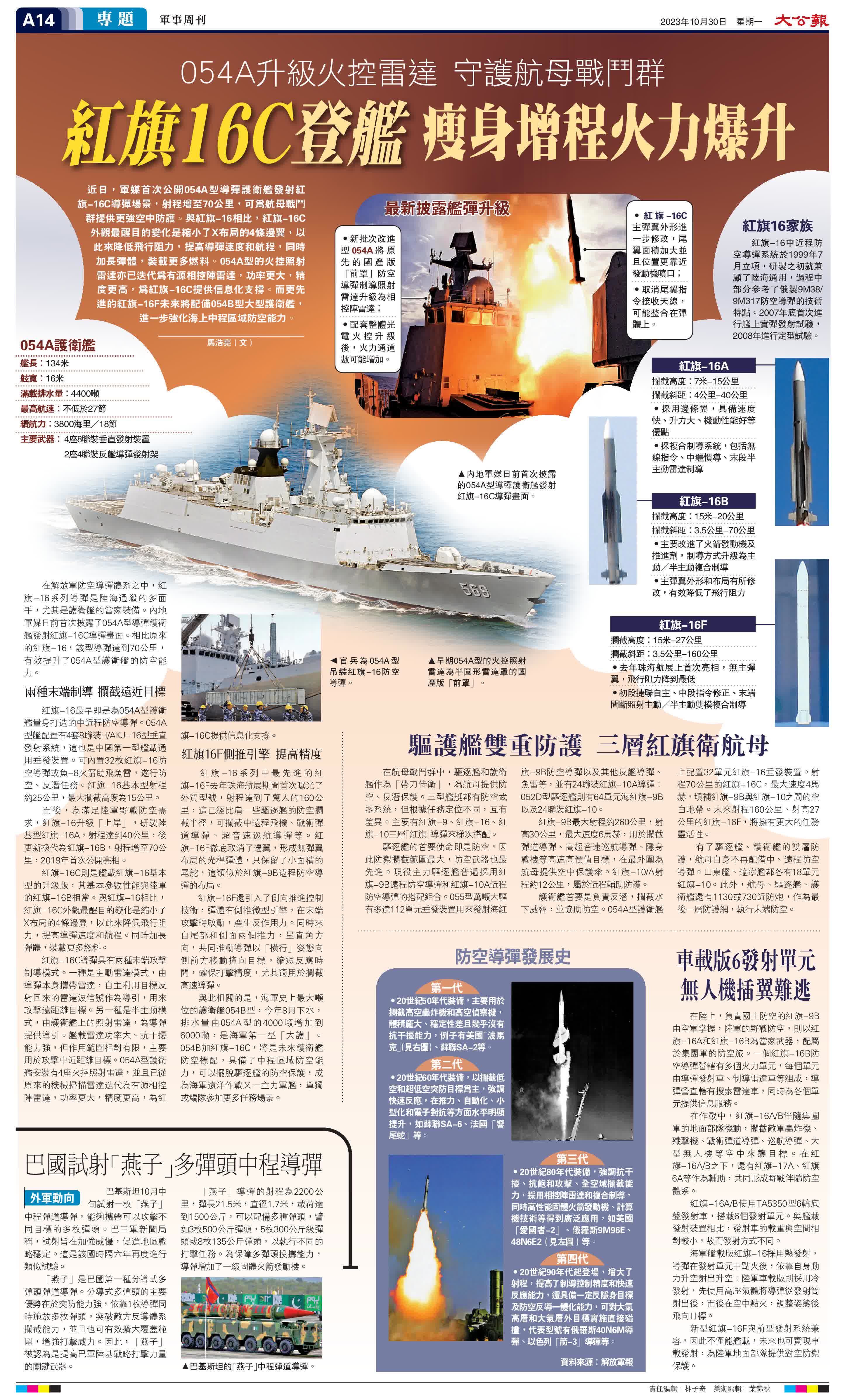 護衛艦首要是負責反潛,攔截水下威脅,並協助防空。054A型護衛艦上配置32單元紅旗-16垂發裝置。射程70公里的紅旗-16C,最大速度4馬赫,填補紅旗-9B與紅旗-10之間的空白地帶。未來射程160公里、射高27公里的紅旗-16F,將擁有更大的任務靈活性。