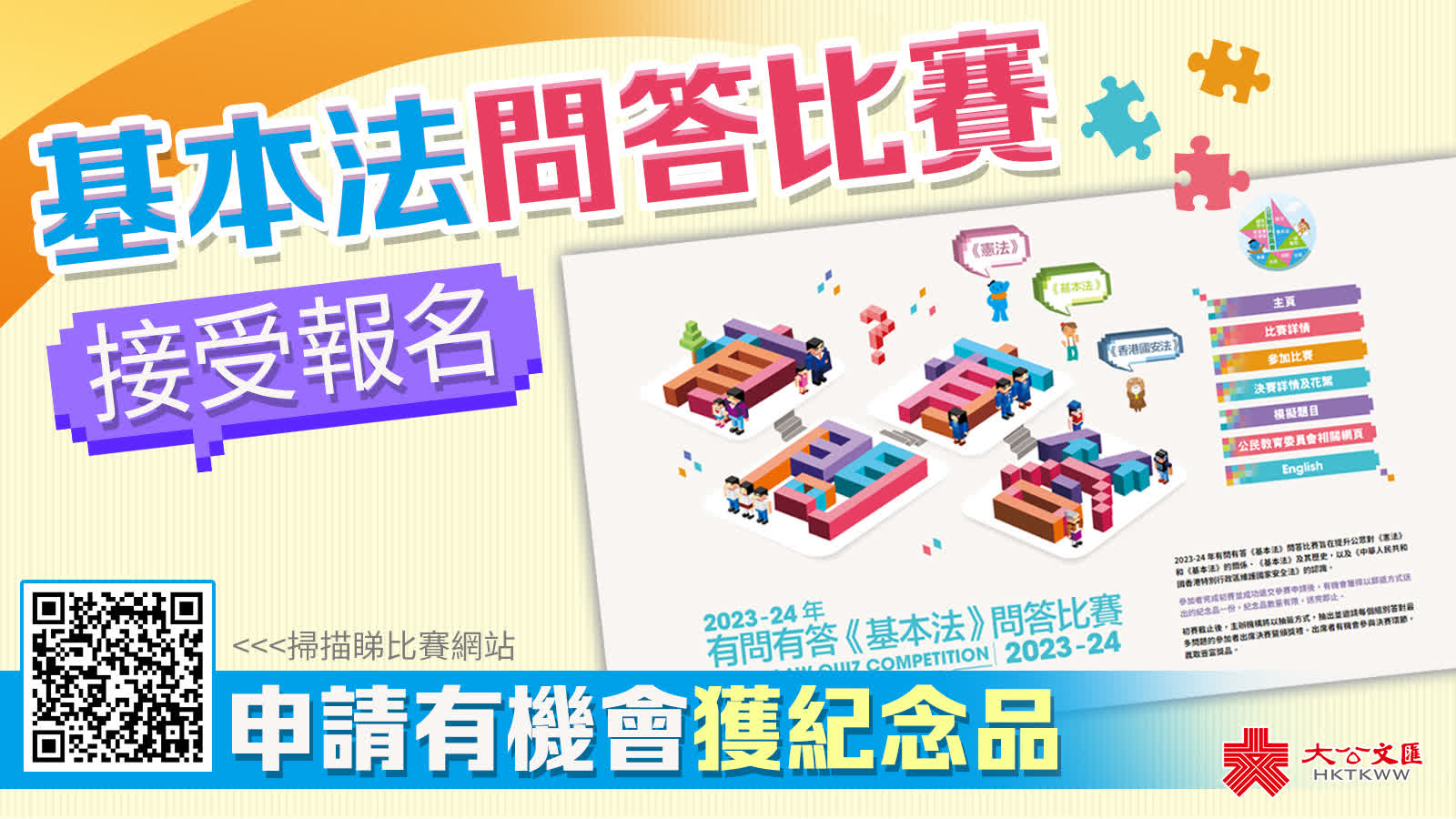 大公文匯全媒體報道,為提升公眾對憲法和基本法的關係、基本法及其歷史,以及《中華人民共和國香港特別行政區維護國家安全法》的認識,民政及青年事務局、公民教育委員會及憲法和基本法推廣督導委員會本地社區工作小組舉辦新一屆「有問有答基本法問答比賽」。比賽初賽今日(30日)開始接受參賽申請,歡迎大家踴躍參與。