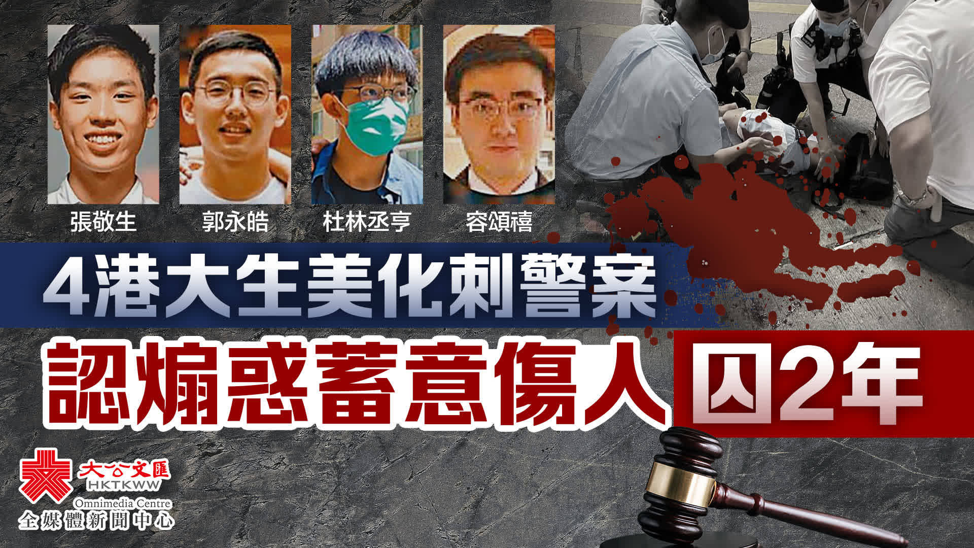 4名被告依次為張敬生(21歲)、郭永皓(22歲)、杜林丞亨(22歲)及容頌禧(21歲),案發時均為香港大學學生。他們承認一項交替控罪,即煽惑他人有意圖而傷人罪,控罪指4人於2021年7月7日,在香港非法煽惑他人,意圖使警務人員身體受嚴重傷害,而非法及惡意傷害警務人員。他們原被控的宣揚恐怖主義罪獲撤銷。