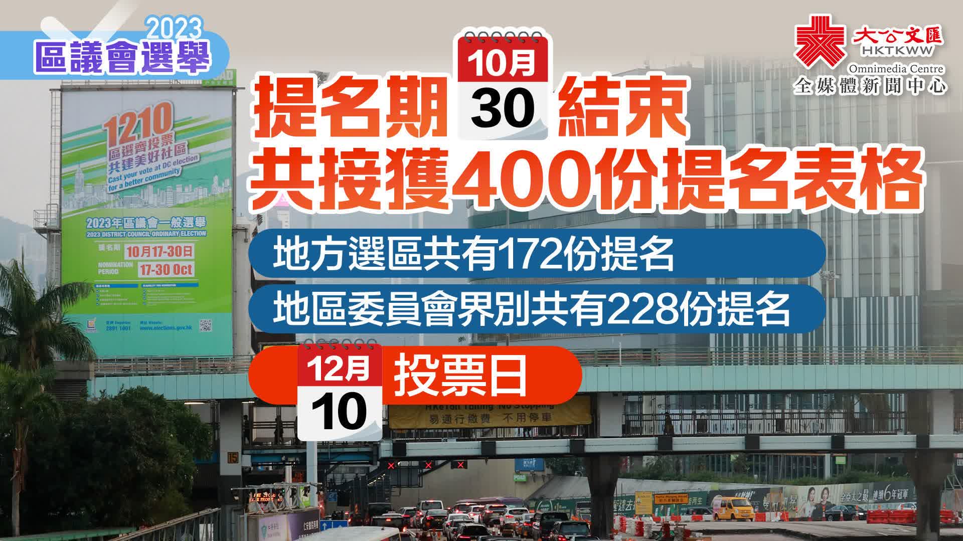 大公文匯全媒體報道,2023年區議會一般選舉的提名期於10月17日展開,至今日(10月30日)下午五時結束。連同今日接獲的2份提名表格,18個地區委員會界別和44個區議會地方選區的選舉主任於提名期內共接獲400份提名表格。