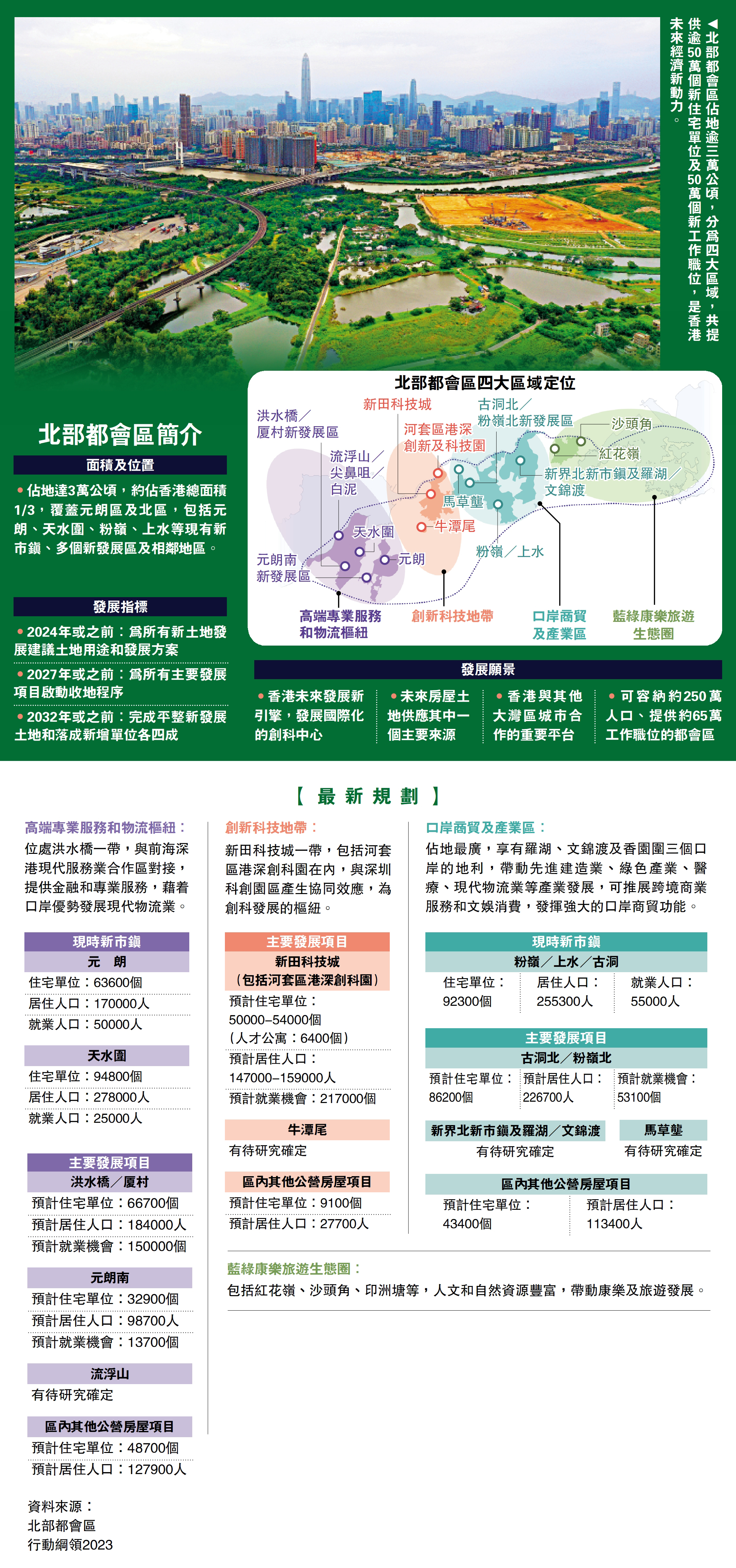 (大公報記者 王亞毛)《北部都會區行動綱領》出爐,北都發展開新篇,成為香港經濟新動力。政府昨日公布《北部都會區行動綱領》,提出以產業導向規劃北都發展,把三萬公頃用地劃分為四大區域,合共提供逾50萬個新住宅單位,以及50萬個新工作職位。政府目標是明年或之前完成新土地項目規劃,2027年或之前啟動收地程序,最遲2032年完成四成土地平整工作及落成四成新增單位。