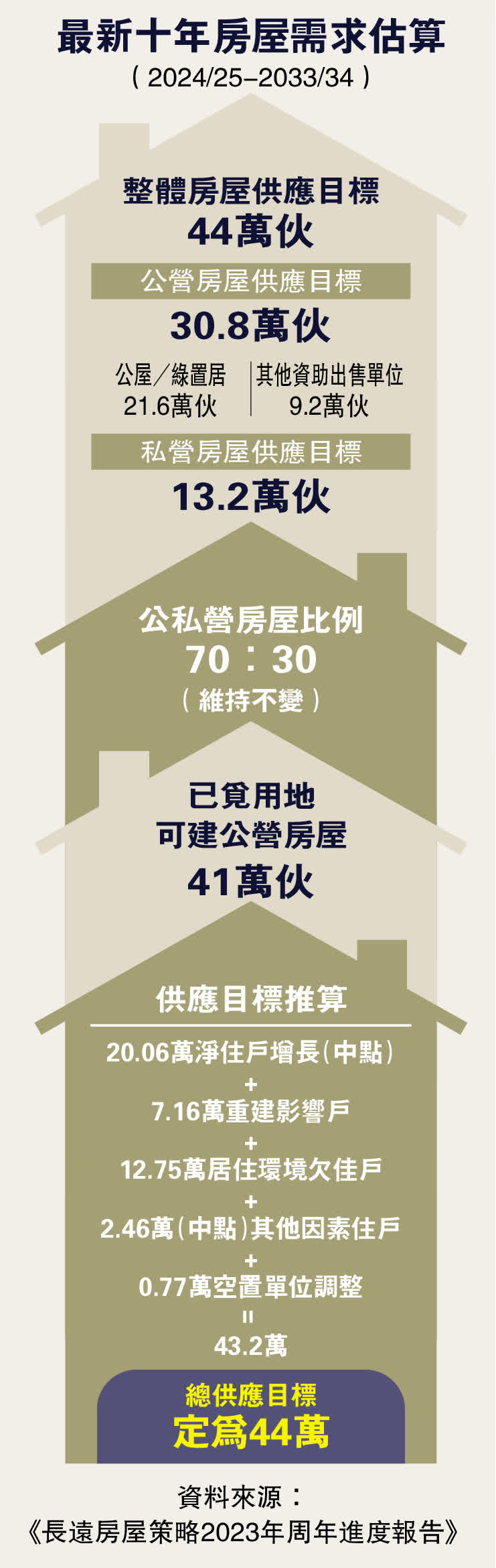 根據《長遠房屋策略》既定的推算方法,下一個十年期的總房屋需求為43.2萬個單位,政府因而將供應目標定於44萬個單位。房屋局發言人表示,公私營房屋比例維持70:30,按此比例,公營房屋供應目標為30.8萬個單位,包括公屋、綠置居及其他資助出售房屋。