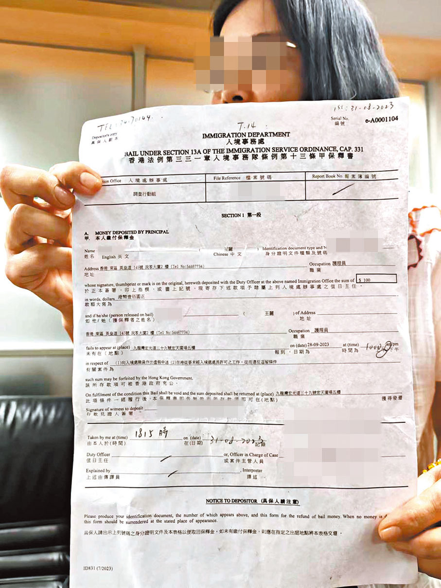 勞工處循例將案件轉交給入境處,後者依違反入境條例方向進行調查,多次約談A與B,並在8月31日和8月30日,以向入境處職員作出虛假陳述及在港從事未經入境處處長許可之工作,違反逗留條件為由,先後為A與B開具保書。B在接受香港文匯報訪問時說:「我們老闆說我們被告了,讓我們自己找入境處調查組改口供。我也第一次來香港,老老實實地按指派做事,我怎麼就犯法了呢?」談及此處,B一度委屈哽咽。