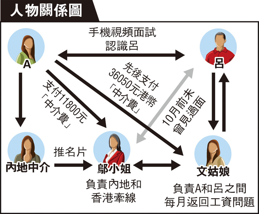 A表示,自己是通過中介在網上認識了鄔××,後者又將A聯繫方式給了文××,再由文將其微信推給了呂××(男)並安排視頻面試。A說,鄔負責與內地中介聯繫;文負責與香港院舍聯繫,並在A入職後負責與呂之間每月工資返還問題與A溝通。不過,兩人都並非內地中介和涉事院舍的工作人員。