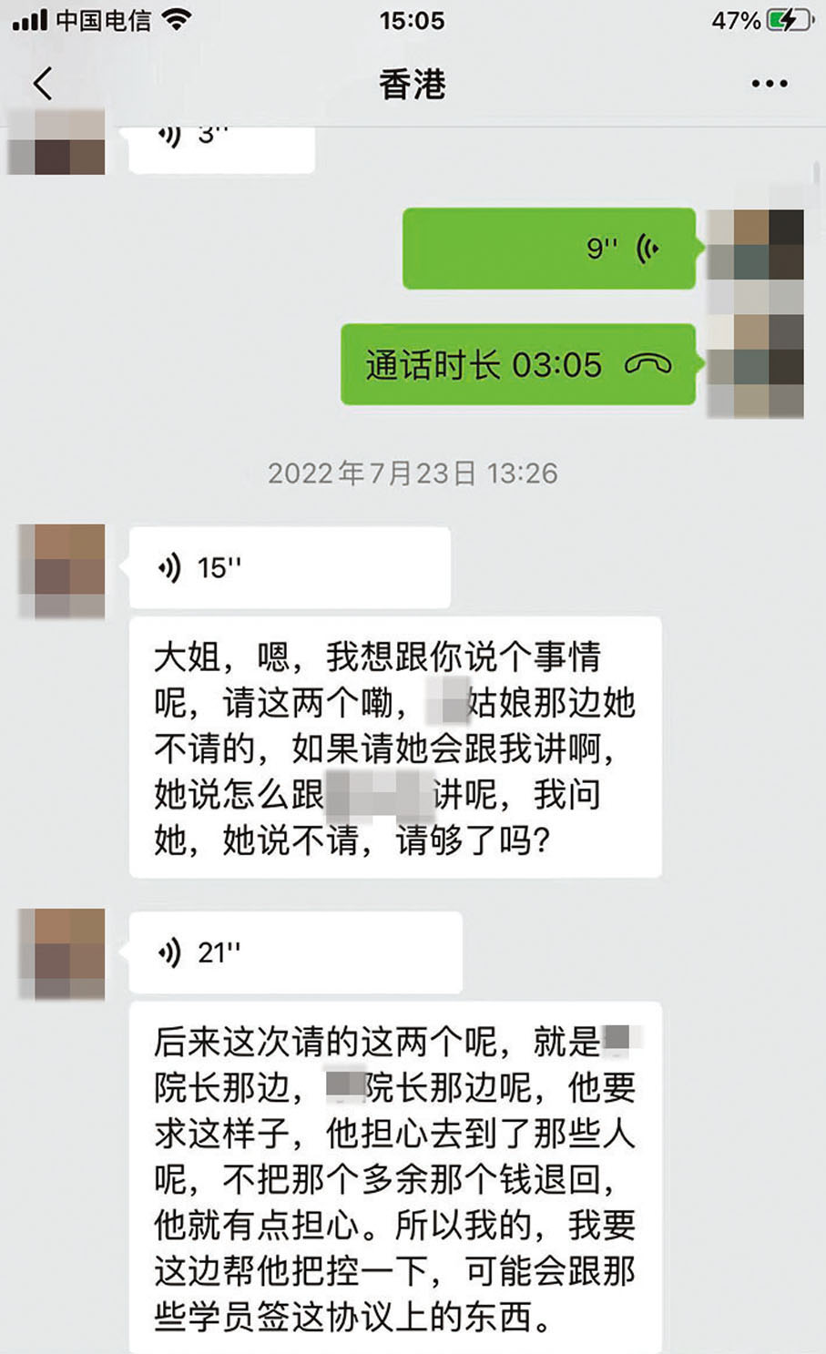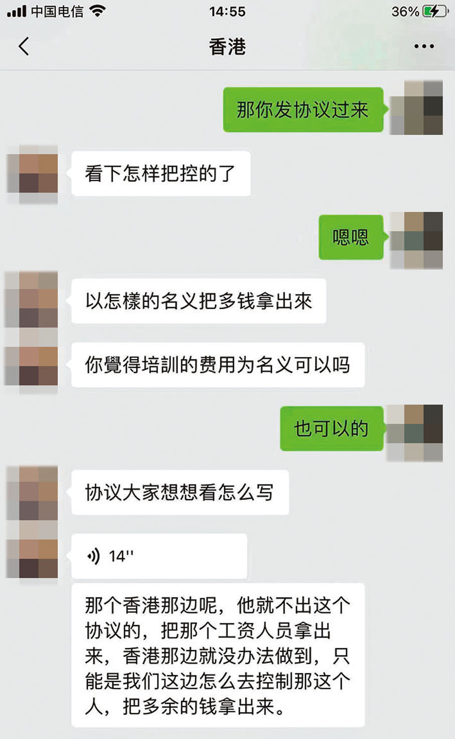 A稱,在視頻面試時,呂有親口說過,工資只開9,000元港幣,但工資卡每個月會到賬14,150元,多餘的部分需要退回。據內地中介提供、與疑為鄔於去年7月23日的微信聊天紀錄顯示,有人在商議用何種方法將高出9,000元的工資套取出來,其中疑為鄔的人草擬了一個欠條,詢問內地中介是否可以讓護工A簽署,內地中介稱不可以。鄔又稱,是否可以用培訓名義將錢套出來。並稱呂老闆擔心護工不會將多出的錢吐出來,但香港院舍不擬相關協議,要求鄔和內地中介方面進行風險把控。