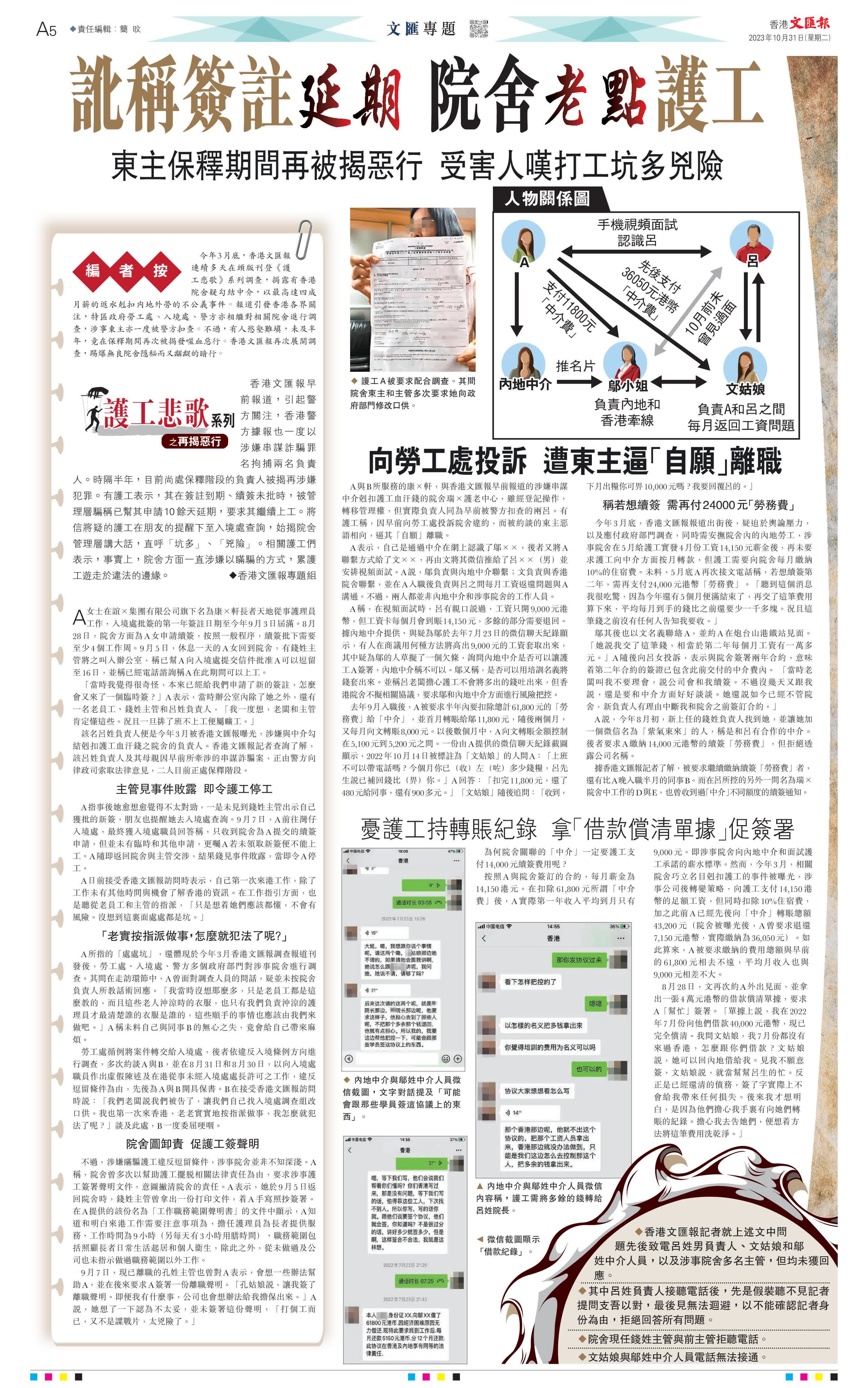 編者按:今年3月底,香港文匯報連續多天在頭版刊登《護工悲歌》系列調查,揭露有香港院舍疑勾結中介,以最高達四成月薪的返水剋扣內地外勞的不公義事件。報道引發香港各界關注,特區政府勞工處、入境處、警方亦相繼對相關院舍進行調查,涉事東主亦一度被警方扣查。不過,有人慾壑難填,未及半年,竟在保釋期間再次被揭發噬血惡行。香港文匯報再次展開調查,踢爆無良院舍隱秘而又齷齪的暗行。