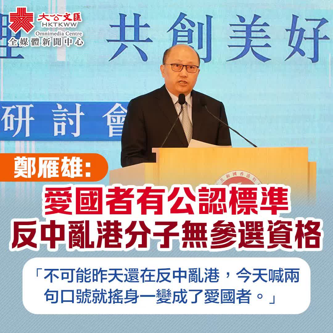 鄭雁雄在發言時指出,對於愛國者的判斷,既要聽其言更要觀其行,既要看表面也要看實際,不可能昨天還在反中亂港,或者所屬政團還在反中亂港,今天喊兩句口號就搖身一變成了愛國者。