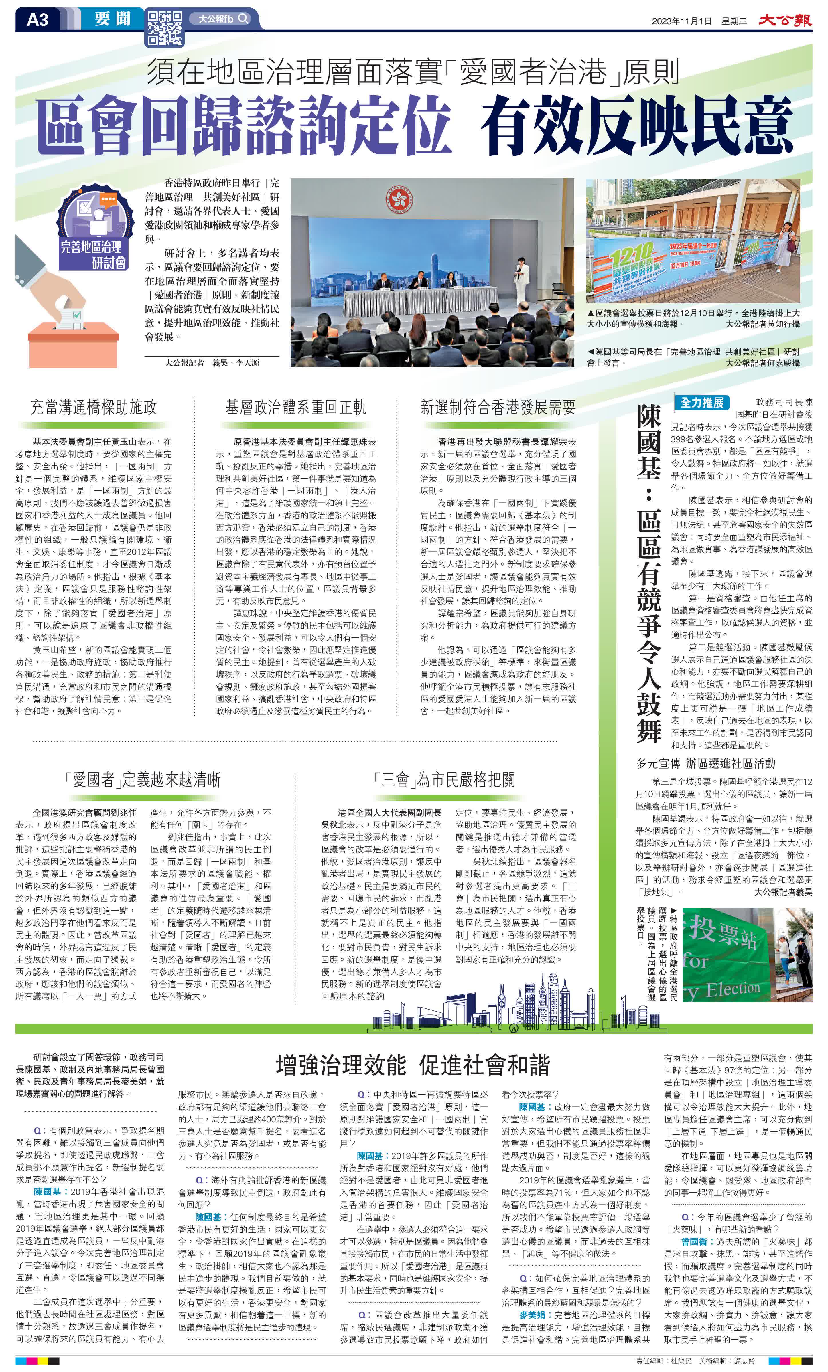 陳國基:2019年香港社會出現混亂,當時香港出現了危害國家安全的問題,而地區治理更是其中一環。回顧2019年區議會選舉,絕大部分區議員都是透過直選成為區議員,一些反中亂港分子進入議會。今次完善地區治理制定了三套選舉制度,即委任、地區委員會互選、直選,令區議會可以透過不同渠道產生。
