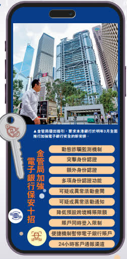 (大公報 記者 邵淑芬)網上騙案持續上升,金管局早前透露,今年首9個月收到954宗涉及詐騙的銀行投訴個案,已遠超過去年全年的555宗。為防患未然,金管局再推10招加強電子銀行安全,包括多重身份認證、賬戶異常或可疑操作通知,以及快速暫停電子銀行賬戶等。金管局已向銀行發出指引,要求本港銀行於明年3月全面推行新安排。