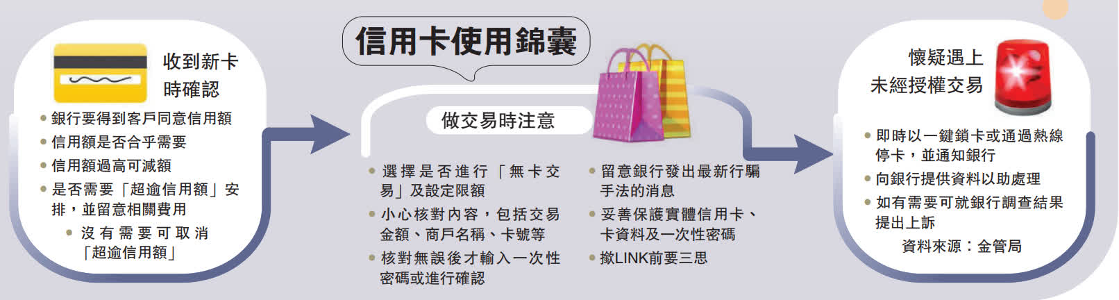 此外,之前有客戶信用卡懷疑被盜用時,未能即時打通銀行電話暫停信用卡服務。金管局會要求銀行設立專屬熱線電話或電子銀行平台即時暫停電子銀行或信用卡賬戶,並禁止同一時間多於一個裝置登入電子銀行賬戶。